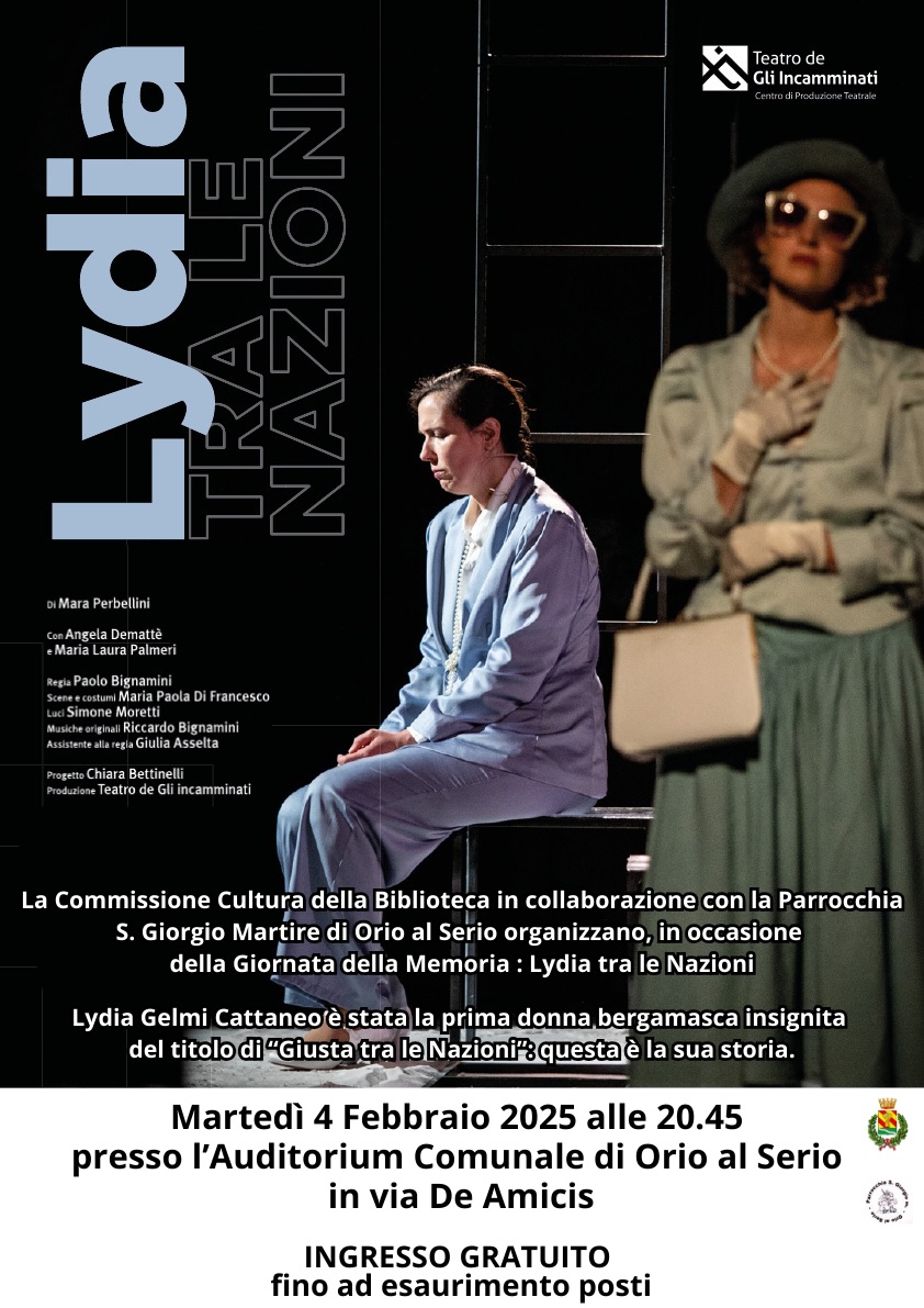 In occasione della Giornata della Memoria, la Commissione Cultura della Biblioteca del Comune di Orio al Serio propone lo spettacolo teatrale "Lydia tra le Nazioni": Lydia Gelmi Cattaneo, prima bergamasca a ricevere il riconoscimento di Giusta tra le nazioni per aver salvato numerosi ebrei tra il 1943 e il 1945. Lo spettacolo prende spunto dalla sua avventurosa vita per raccontare un momento storico complesso. La vicenda di Lydia pone una domanda scomoda: è giusto salvare, oltre alle vittime, anche dei criminali, quando sono in pericolo di vita? Lydia è chiamata a rendere conto delle sue azioni di fronte alla sua coscienza e a un simbolico tribunale della Storia.
