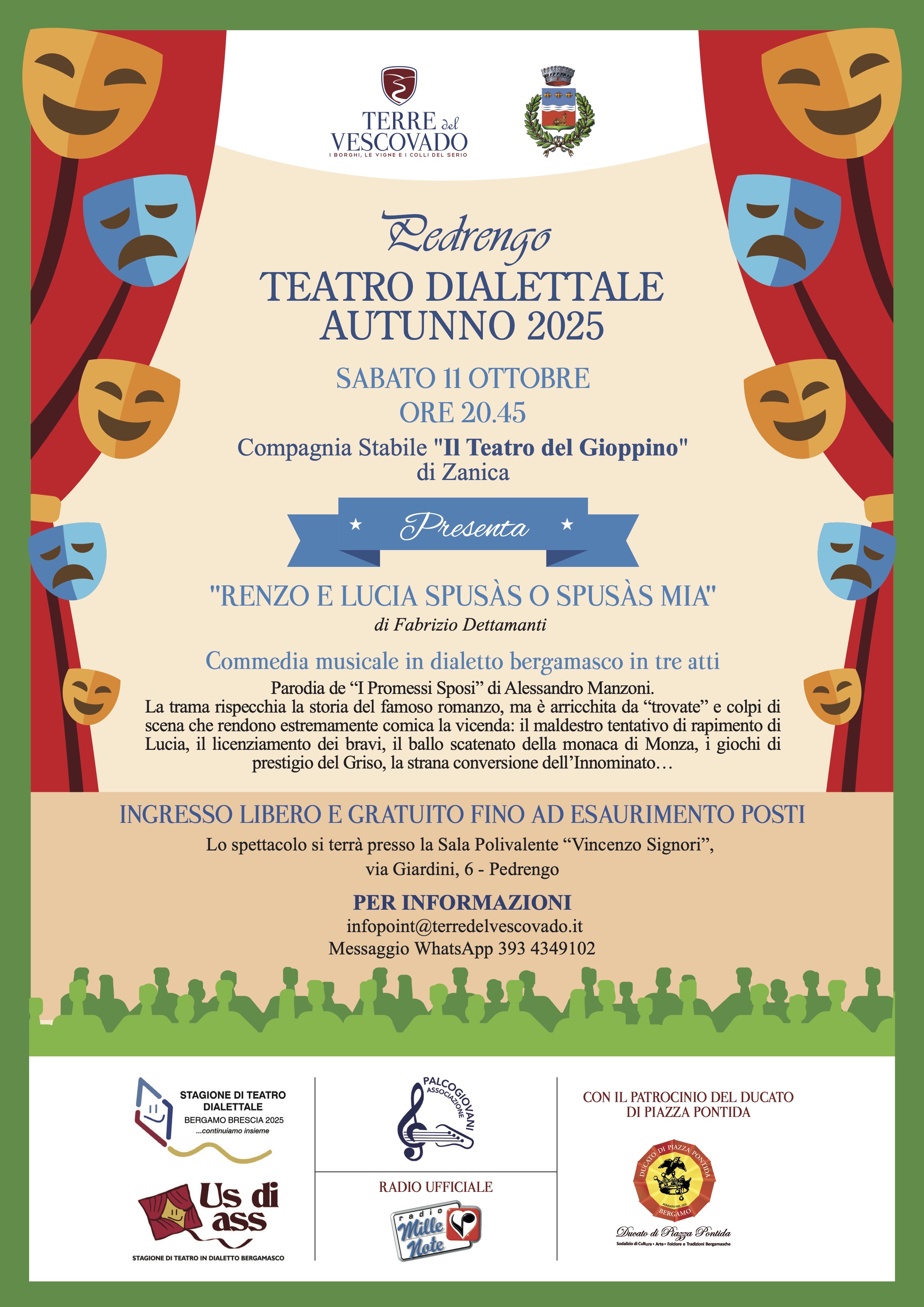La storica compagnia stabile Il Teatro del Gioppino di Zanica porterà in scena "Renzo e Lucia spusas o spusas mia", una commedia musicale in tre atti scritta da Fabrizio Dettamanti e recitata interamente in dialetto bergamasco.