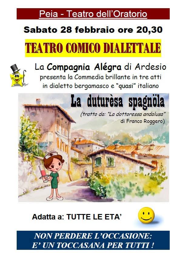 Una serata di risate e tradizione con la Compagnia Alégra di Ardesio, che porta in scena una commedia brillante in tre atti in dialetto bergamasco e “quasi” italiano: «La duturèssa spagnòla», tratta da «La dottoressa andalusa» di Franco Roggero.