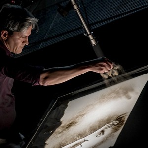 Sul palco, tele e pennelli lasciano spazio ai piccoli granelli di sabbia, che vengono sapientemente stesi su un pannello luminoso, creando eleganti e raffinate illustrazioni che sembrano prendere forma per magia.