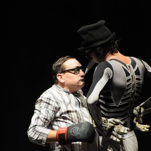 Un cartone animato in bianco e nero, un film muto con due attori in carne e ossa. La scena si apre su un vuoto, nessun oggetto sul palcoscenico, solo la luce che lentamente cresce. Irrompe un personaggio che rappresenta una persona qualunque e che lentamente si costruisce il proprio destino e il proprio futuro intorno a una casa invisibile, disegnata sulla scena con semplici linee bianche. Una figura inattesa viene a turbare i propri piani e inizia a mutare la normale vita dello spensierato uomo. La parabola e la dinamica tra i due personaggi ci descrive in maniera semplice e diretta i conflitti tra gli esseri umani; tra il bianco e il nero, tra il buono e il cattivo, tra un uomo e la sua ombra. Con pochissimi artifici scenici e l’originale uso della musica dal vivo si racconta una storia vecchia come il mondo che si dipana tra conflitti, equivoci e gag divertenti e poetiche allo stesso tempo. Il linguaggio usato è quello del teatro fisico, della clownerie e dei film muti.