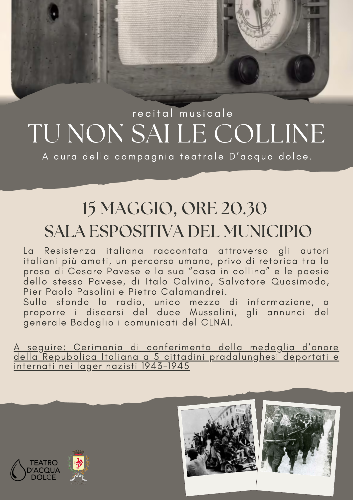 Presso la sala espositiva del Municipio di Pradalunga, giovedì 15 maggio va in scena il recital musicale dal titolo "Tu non sai le colline", a cura della compagnia teatrale D'Acqua dolce.