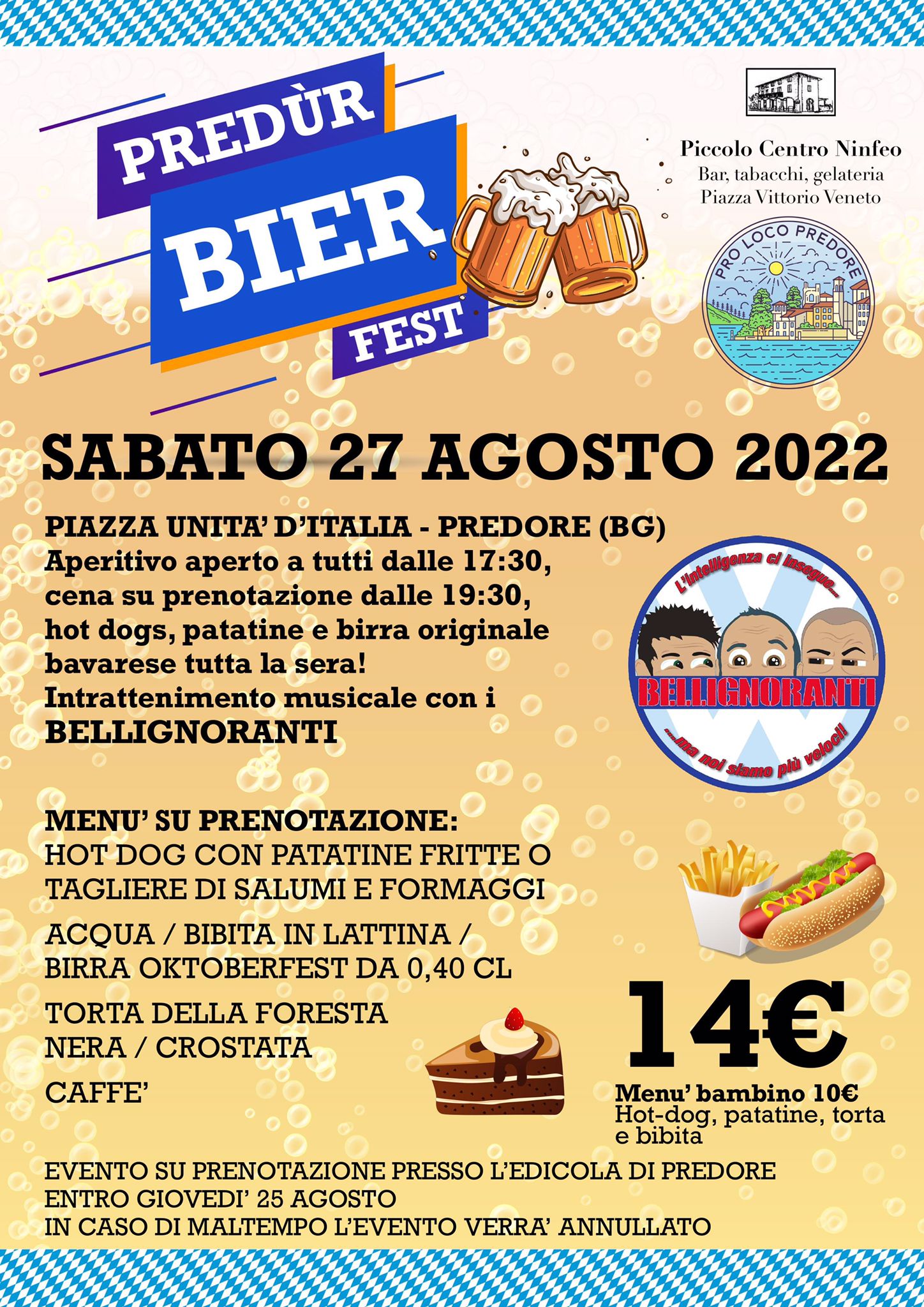 Sabato 27 agosto, presso la Piazza Unità d'Italia a Predore, si terrà la seconda edizione della festa della birra "Predùr Bier Fest"; possibilità di cenare e degustare ottima birra!