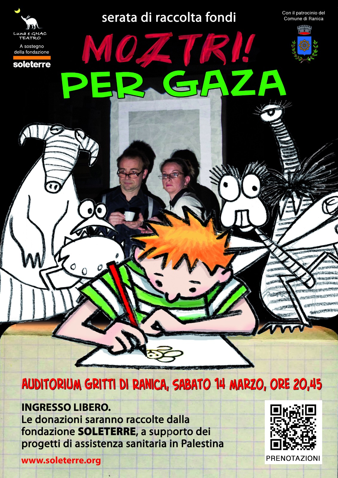 Il 14 marzo l'associazione Soleterre quindi organizza una serata a Ranica con il patrocinio del Comune in cui unire tutto: una replica dello spettacolo «MOZTRI!» da donare alla Fondazione Soleterre, in cui sarà possibile anche acquistare il libro I miei mostri gentili di Chiara e Francesca Gualandris, sempre allo scopo di sostenere i progetti della Fondazione.