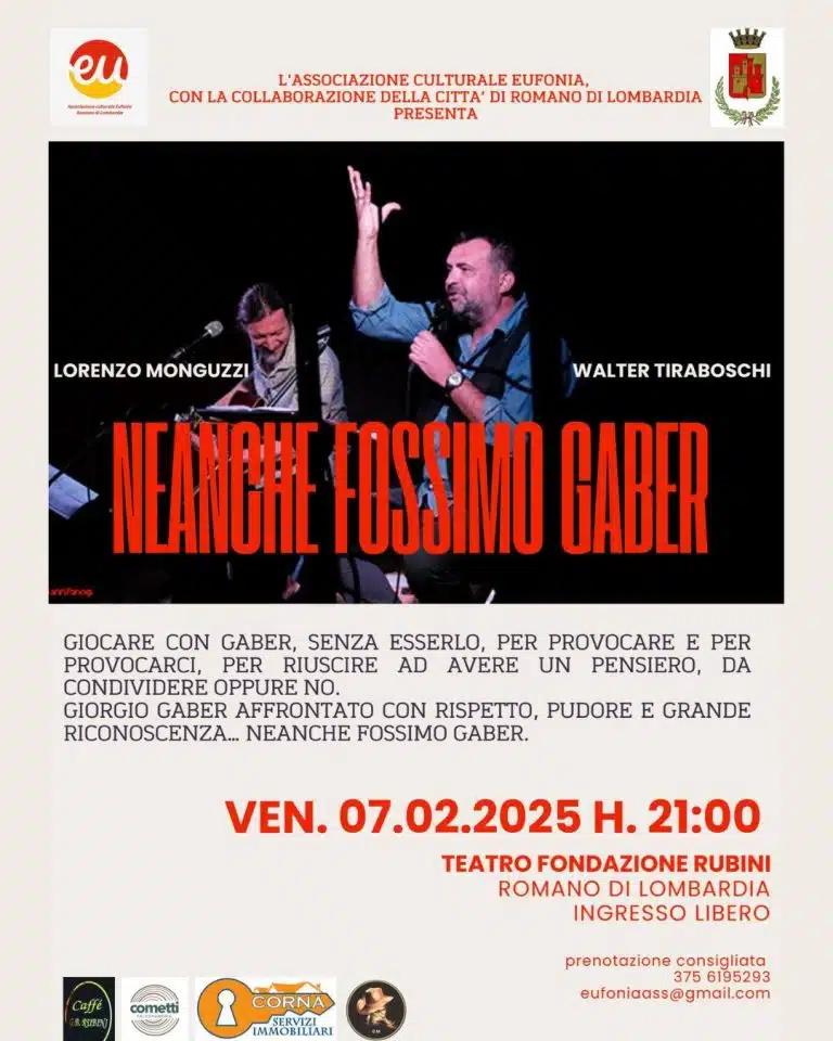 Un omaggio unico a Giorgio Gaber, affrontato con rispetto, pudore e grande riconoscenza. In questo spettacolo, Lorenzo Monguzzi e Walter Tiraboschi ci invitano a riflettere, a esplorare e a “giocare” con l’universo di Gaber, senza mai cercare di imitarlo, ma piuttosto di lasciarsi provocare dalle sue parole, dalla sua musica e dalle sue riflessioni.