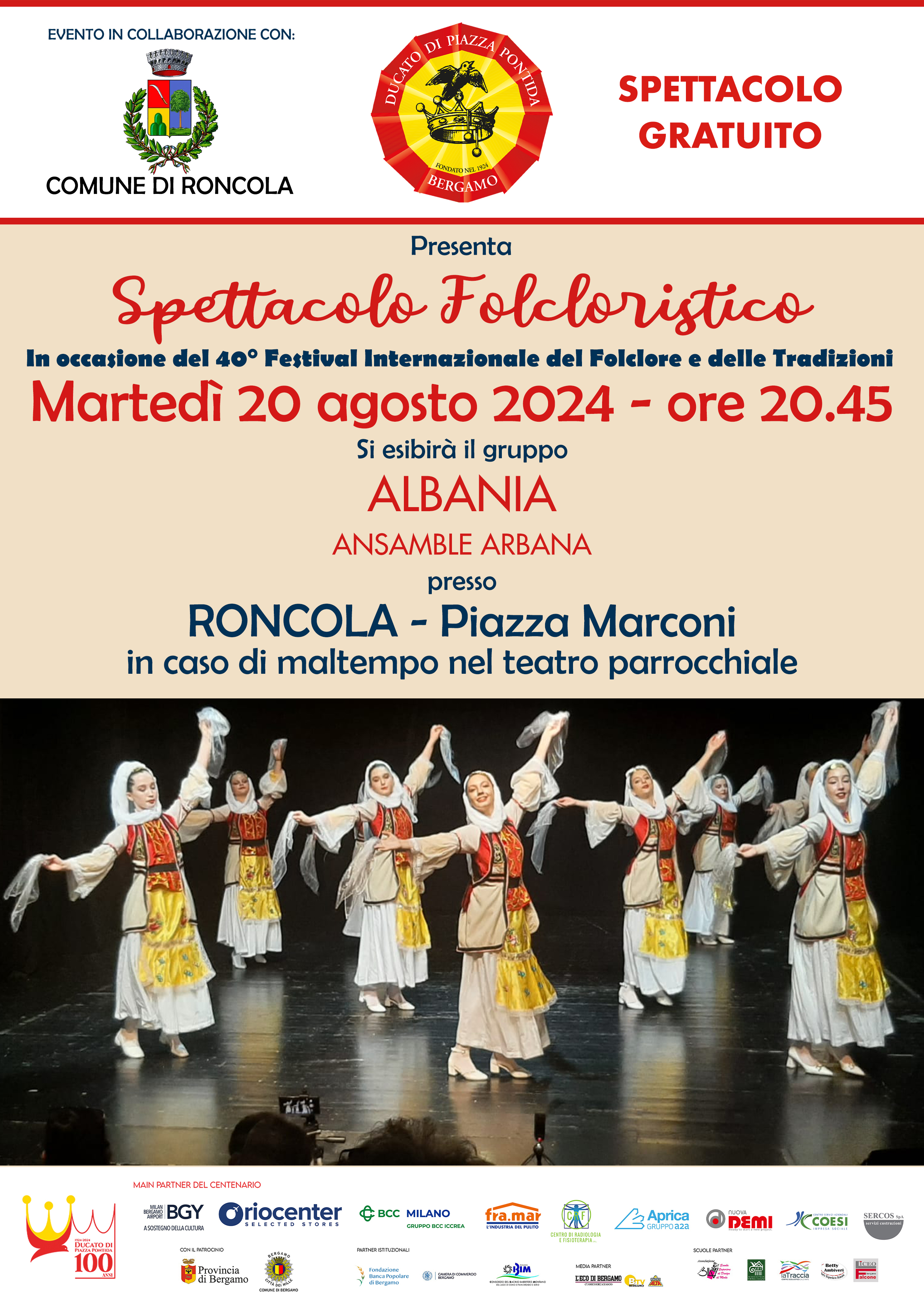 Dal 19 al 26 agosto arriva la 40esima edizione del Festival Internazionale del Folclore e delle Tradizioni. In serata il gruppo Albania si esibirà a Roncola.