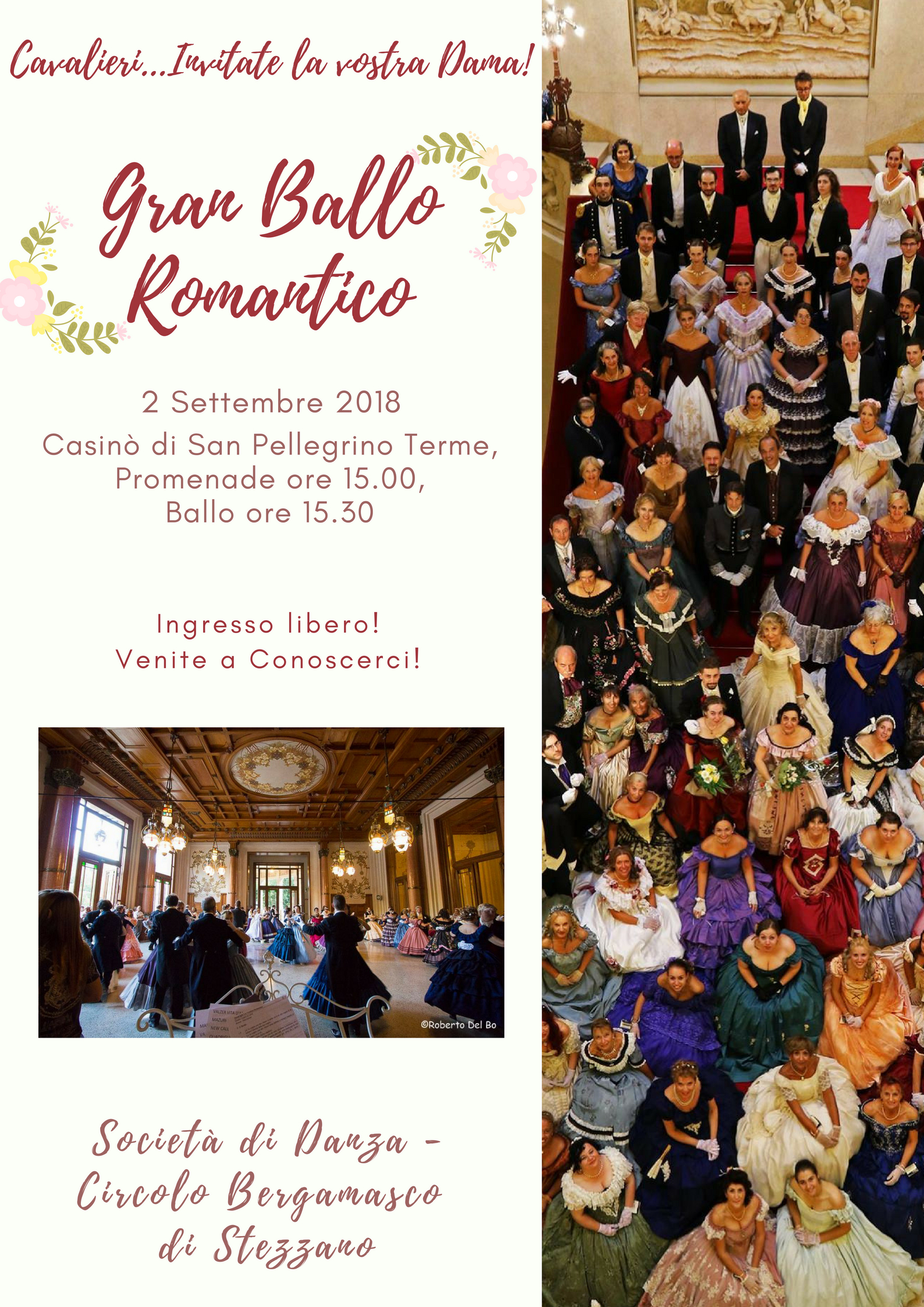 Nella suggestiva cornice del Casinò di San Pellegrino Terme avrà luogo il «Gran Ballo Romantico» con la partecipazione di 120 danzatori in abiti ottocenteschi, provenienti da tutta Italia.