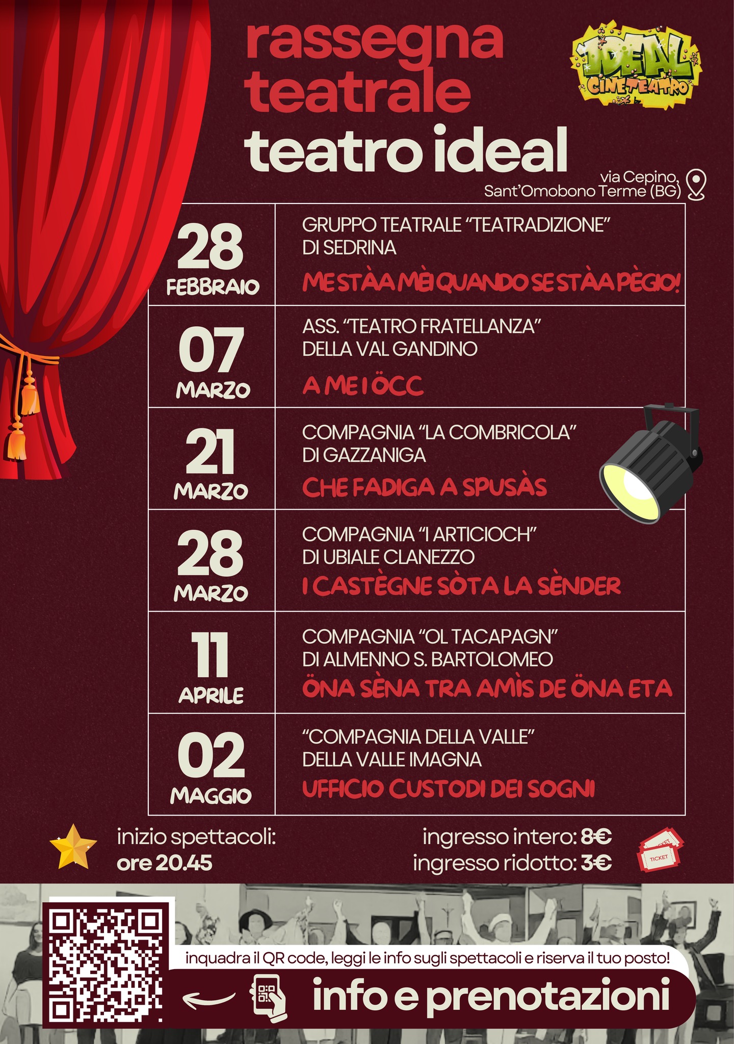 Continua la rassegna teatrale del Teatro Ideal di Sant'Omobono Terme. Sul palco la compagnia dialettale La Combricola Gino Gervasoni di Gazzaniga con una commedia in tre atti.