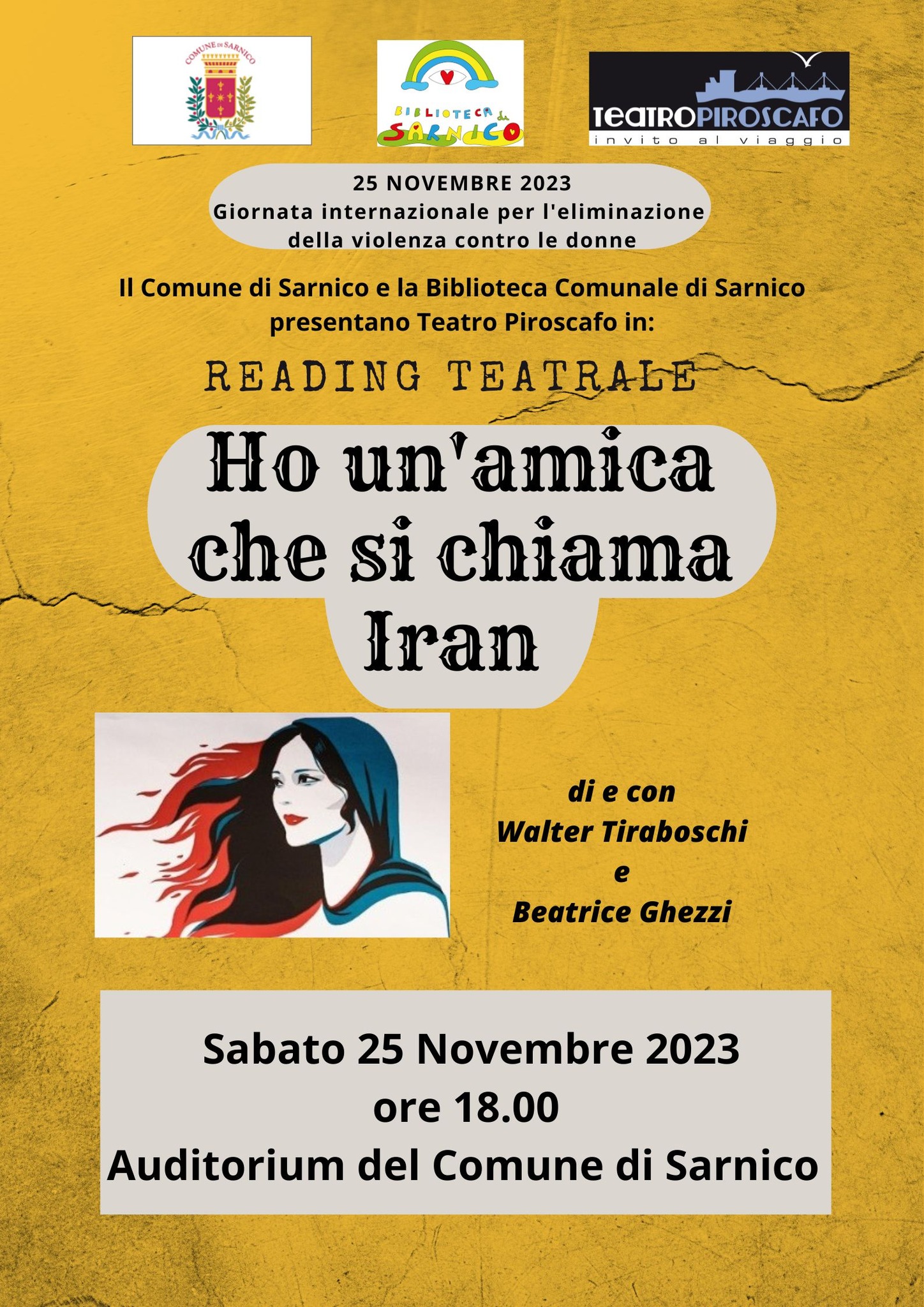 In occasione della "Giornata internazionale per l’eliminazione della violenza sulle donne", sabato 25 novembre alle ore 18.00, si terrà il reading teatrale "Ho un'amica che si chiama Iran", di e con Walter Tiraboschi e Beatrice Ghezzi, presso l'Auditorium Comunale di Sarnico (via Roma, 54).
