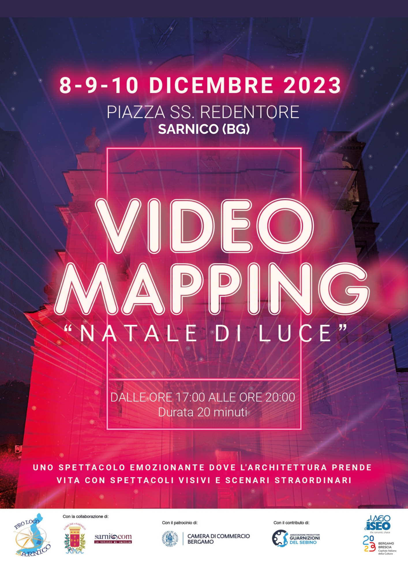 In occasione di Sarnico Magic Christmas, da venerdì 8 dicembre a domenica 10 dicembre, sarà possibile ammirare lo spettacolo di video mapping "Natale di Luce" che animerà la facciata della Chiesa Parrocchiale in Piazza SS. Redentore a Sarnico. Proiezione videomapping: dalle 17:00 alle 20:00