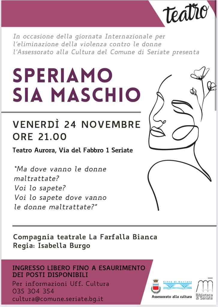 In occasione della giornata Internazionale per l'eliminazione della violenza contro le donne l'Assessorato alla Cultura del Comune di Seriate presenta lo spettacolo "Speriamo sia Maschio" della Compagnia teatrale La Farfalla Bianca.