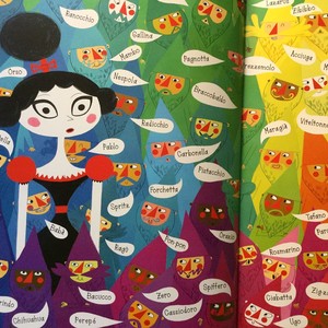 La storia incomincia con la fuga di Biancaneve e l’arrivo alla casetta nel bosco, dove abitano i... 77 nani. Appena varcata la soglia, il primo scoglio da superare è memorizzare i 77 nomi: tutti pronunciati, uno per uno, dai 77 nanetti multicolore che in una sorta di vortice arcobaleno sorprendono e assaltano la giovane Biancaneve. Probabilmente i 77 nani non vedevano l’ora: «in casa c’era un sacco da fare», il bucato, le barbe da spazzolare, le storie della buonanotte (una ciascuno!)... Il passo dalla collaborazione alla pretesa è breve e così, con ancora indosso la camicia da notte con gli uccellini ricamati e i capelli tutti arruffati, Biancaneve deve servire il caffè a 77 nani che richiedono «la colazione nello stesso istante, ovviamente», per non parlare dei 77 fagotti del pranzo, le 77 cene e i piatti... vogliamo parlare dei piatti?! «E dopo tutto questo c’erano ancora i piatti da lavare». Biancaneve «ne ebbe abbastanza... e pazienza se rischiava di incontrare di nuovo la strega», incontro che puntualmente avviene, appena la ragazza si addentra nel bosco. Cosa accadrà, dunque?