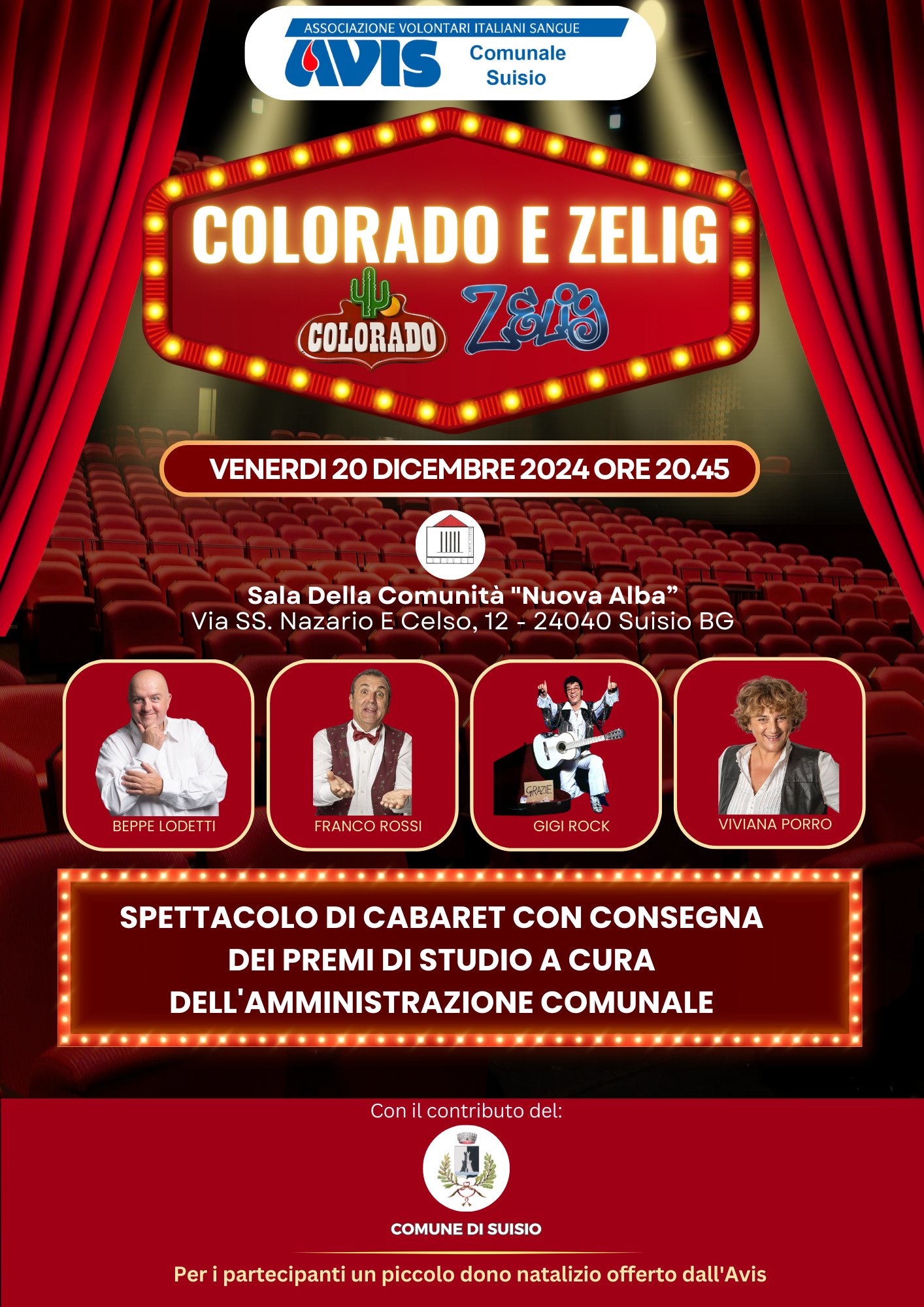 Una serata divertente e spensierata con uno spettacolo di cabaret con protagonisti quattro figure di rilievo del panorama comico italiano. Da Colorado a Zelig, saranno con noi Beppe Lodetti, Franco Rossi, Gigi Rock e Viviana Porro!