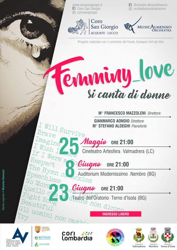L’Orchestra MusicAlmenno di Almenno San Bartolomeo (BG) e il Coro San Giorgio di Acquate (LC) con il concerto “femminy_love - si canta di donne”, vogliono condurre il pubblico in un viaggio attraverso la musica pop e non solo, con arrangiamenti originali realizzati appositamente per orchestra, coro e soli da Luca Belotti, Andrea Brignoli e Stefano Aldeghi. L’intento è di utilizzare questa potente forma d’arte per “cantare” la figura della donna nei suoi molteplici e preziosi aspetti, nelle sfide di ogni giorno e sensibilizzare il pubblico sulla violenza contro le donne, un problema che persiste in molte parti del mondo ed è purtroppo attualissimo anche in Italia. Ogni nota suonerà come un grido di solidarietà, un invito alla consapevolezza e un richiamo all’azione. Oltre a essere un momento di intrattenimento, questo concerto è un atto di impegno collettivo. Gli spettatori saranno immersi in un’esperienza unica, dove la musica diventa una forza attraverso cui speriamo di ispirare una maggiore consapevolezza e azione nella nostra comunità per una grande e necessaria trasformazione sociale. Chiediamo a chiunque presenzierà al ai concerti di riflettere sulle parole e la musica che ascolterete stasera e di considerare come possiamo contribuire, individualmente e collettivamente, a creare un mondo in cui ogni donna possa vivere libera dalla paura e dalla violenza.