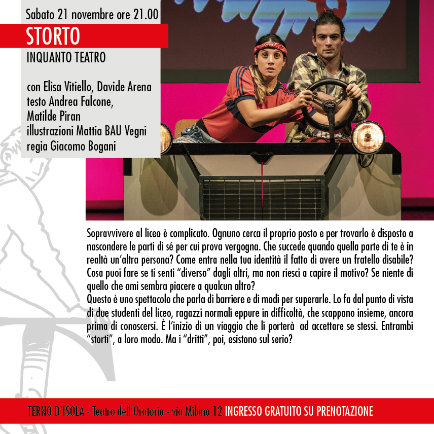 Cosa puoi fare se ti senti “diverso” dagli altri, ma non riesci a capire il motivo? Se niente di quello che ami sembra piacere a qualcun altro? Questo è uno spettacolo che parla di barriere e di modi per superarle. Lo fa dal punto di vista di due studenti del liceo, ragazzi normali eppure in difficoltà, che scappano insieme, ancora prima di conoscersi. È l’inizio di un viaggio che li porterà̀ ad accettare se stessi. Entrambi “storti”, a loro modo. Ma i “dritti”, poi, esistono sul serio?