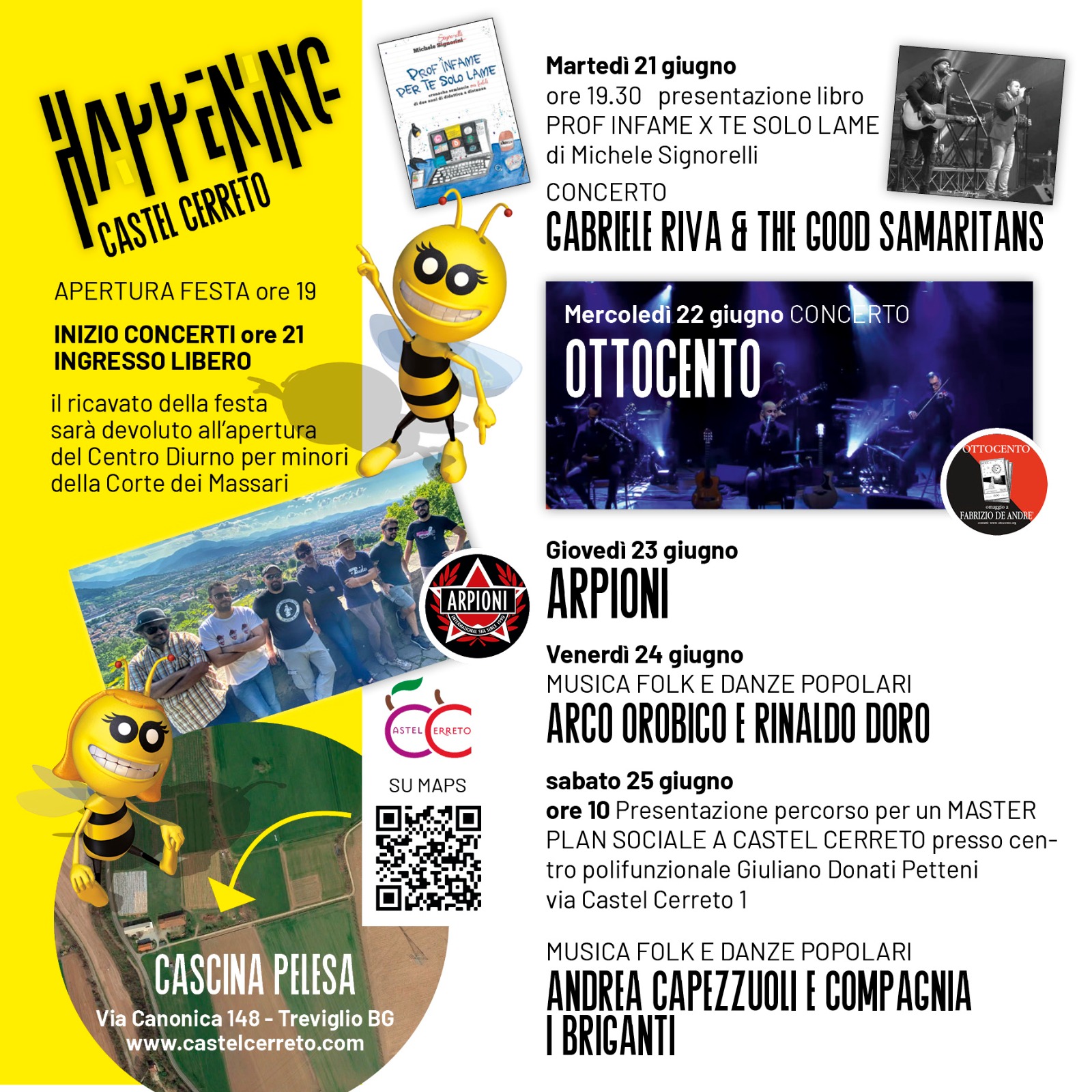 Concerti, incontri, presentazioni di libri e momenti di scambio sociale e culturale saranno gli ingredienti di “Happening Castel Cerreto”, l’evento organizzato dalla Fondazione Istituti Educativi in collaborazione con Cooperativa Alchimia e il Consorzio FA, in programma da martedì 21 a sabato 25 giugno presso Cascina Pellesa (via Canonica, 148), nel piccolo borgo di Castel Cerreto a Treviglio.