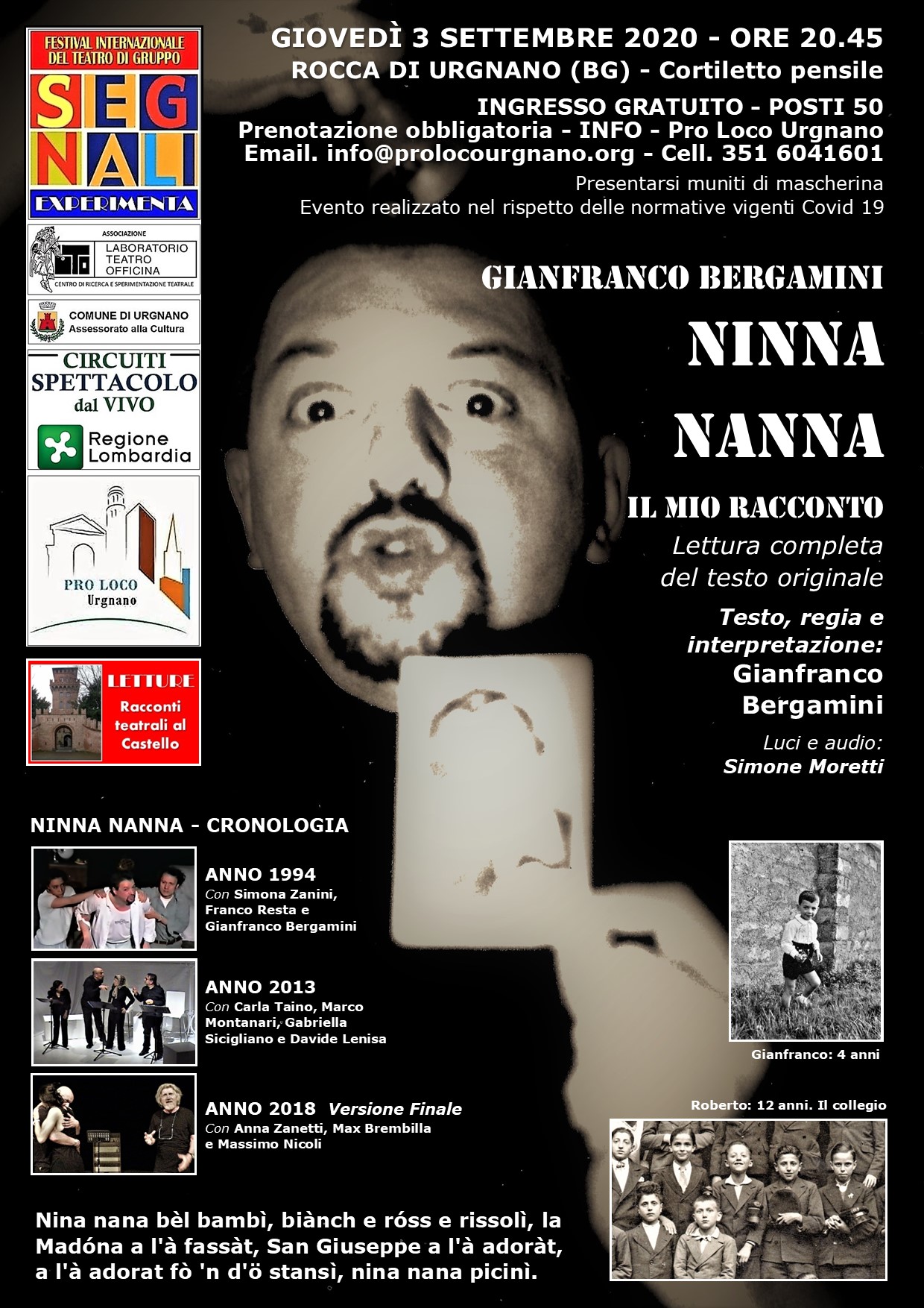 Torna il Festival Internazionale del Teatro di Gruppo “Segnali Experimenta - Circuiti Lombardia Spettacolo dal Vivo”. Si parte con la nuova proposta di “Letture - Racconti Teatrali al Castello”, a cui si aggiungono le sezioni storiche di “Teatro in Famiglia” e dei “Circuiti” veri e propri. La manifestazione è promossa, come sempre, dal Laboratorio Teatro Officina in collaborazione con la Regione Lombardia e l’Assessorato alla Cultura del Comune di Urgnano. A partire da questa trentaduesima edizione sarà dell’organizzazione anche la Pro Loco urgnanese.