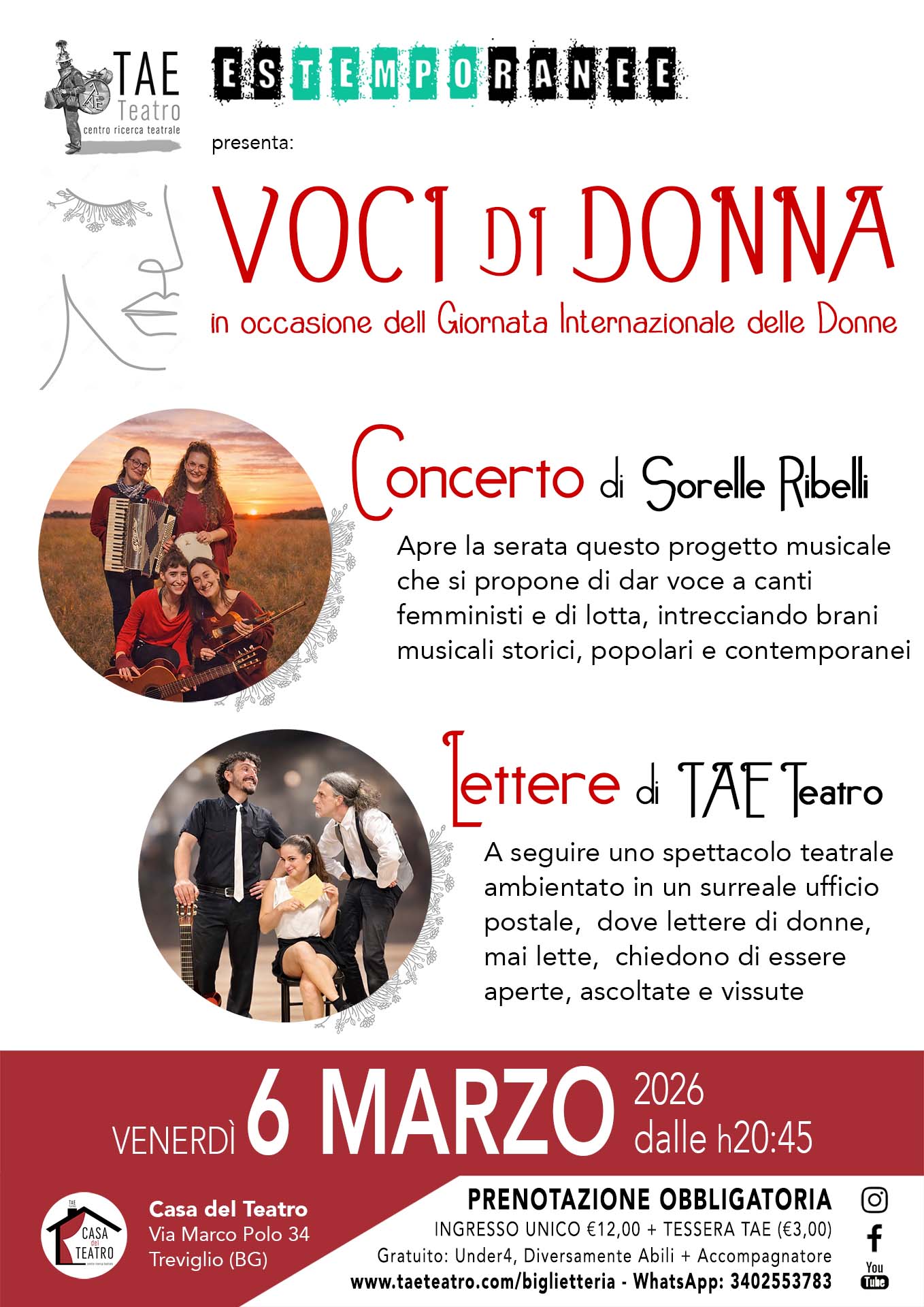 In occasione della Giornata Internazionale della Donna venerdì 6 marzo il TAE Teatro di Treviglio ospita una serata-evento che intreccia musica dal vivo e teatro, parole e canti, ironia e resistenza.