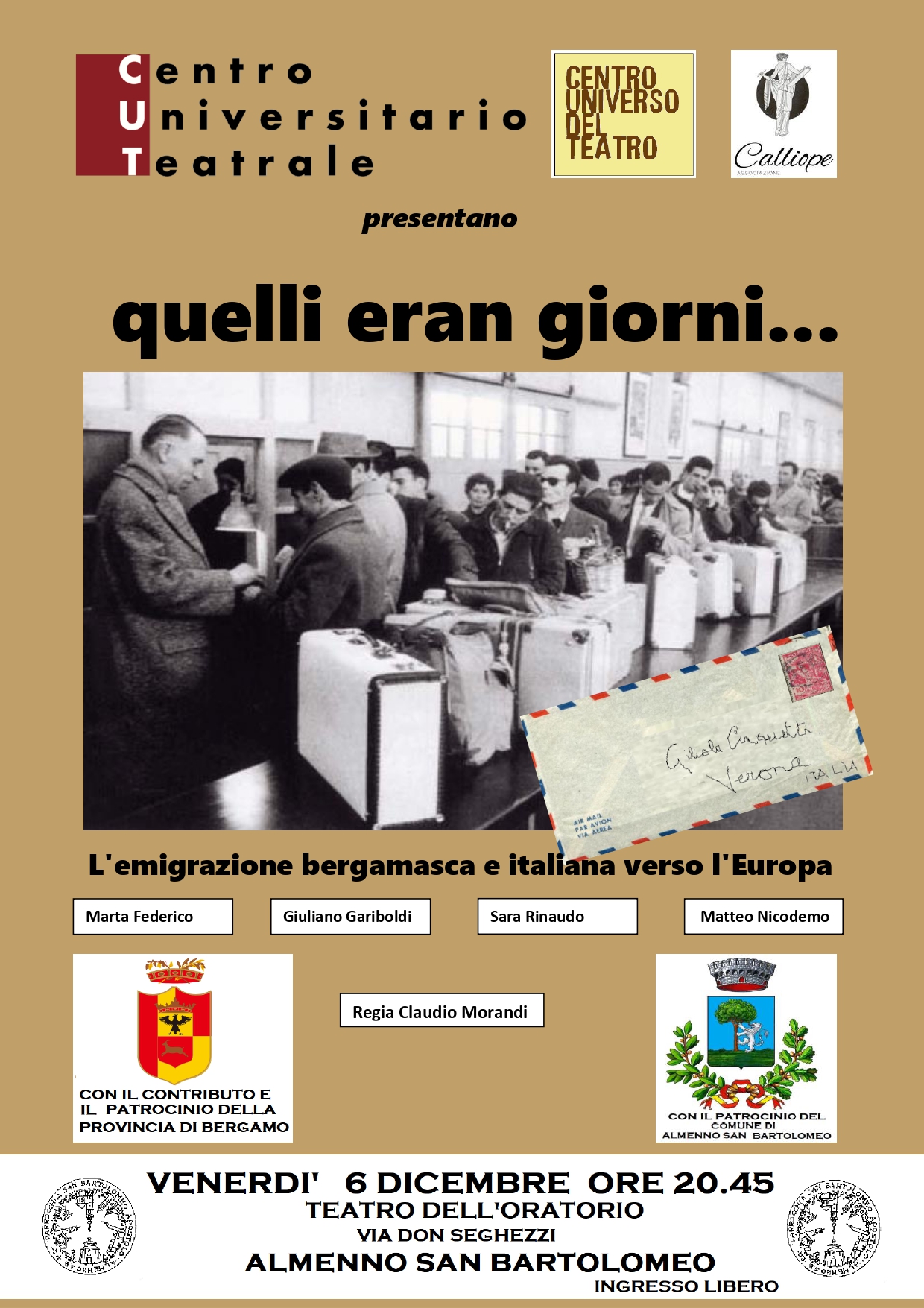 Il 6 dicembre alle 20,45 si terrà presso il Teatro dell'Oratorio lo spettacolo “Quelli eran giorni...”, promosso dall’Amministrazione Comunale di Almenno San Bartolomeo in collaborazione con la Parrocchia di San Bartolomeo.