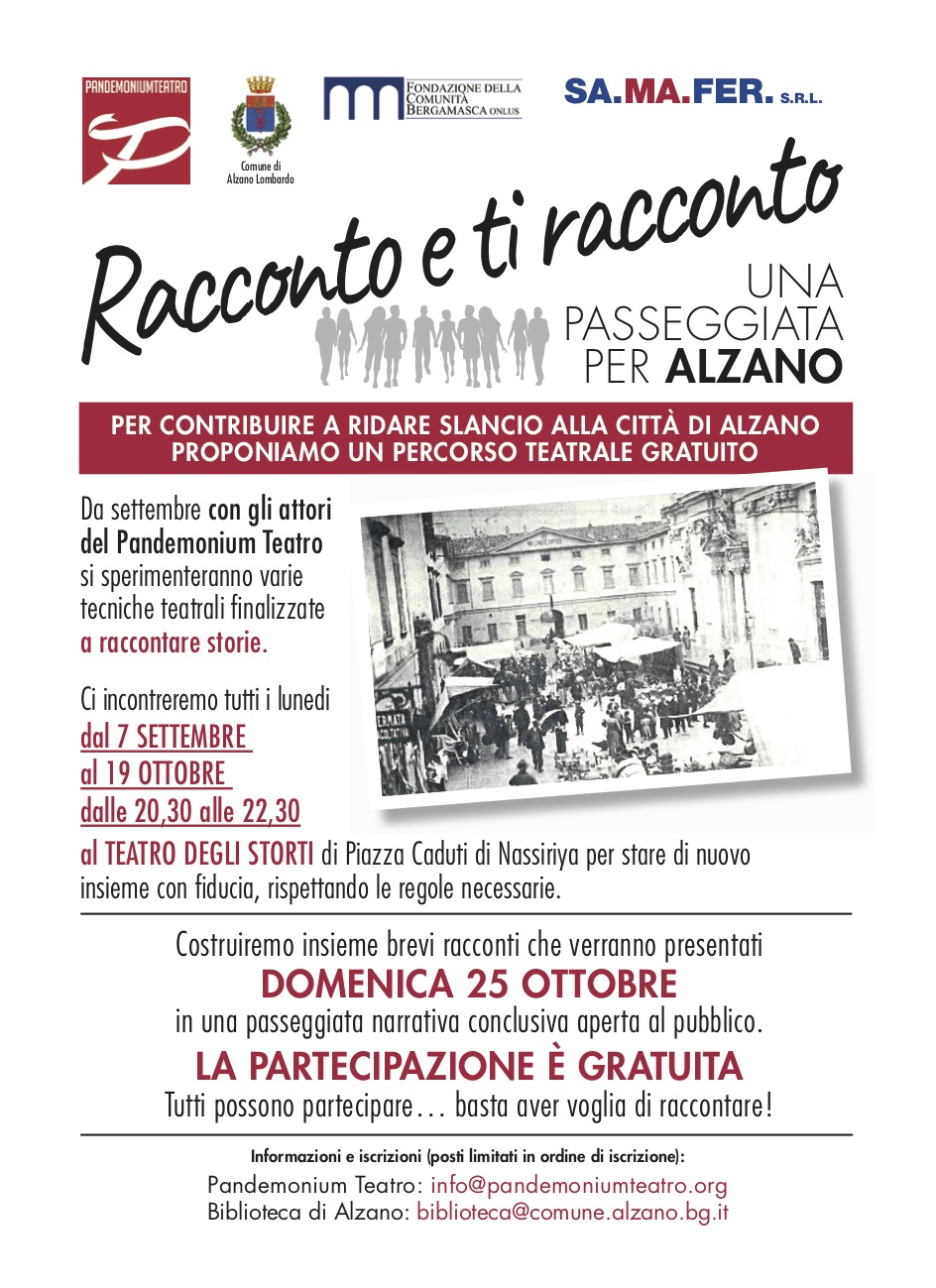 Per contribuire a ridare slancio alla Città di Alzano Pandemonium Teatro propone un percorso teatrale, un laboratorio di narrazione teatrale gratuito aperto a tutti dai 16 anni in poi.