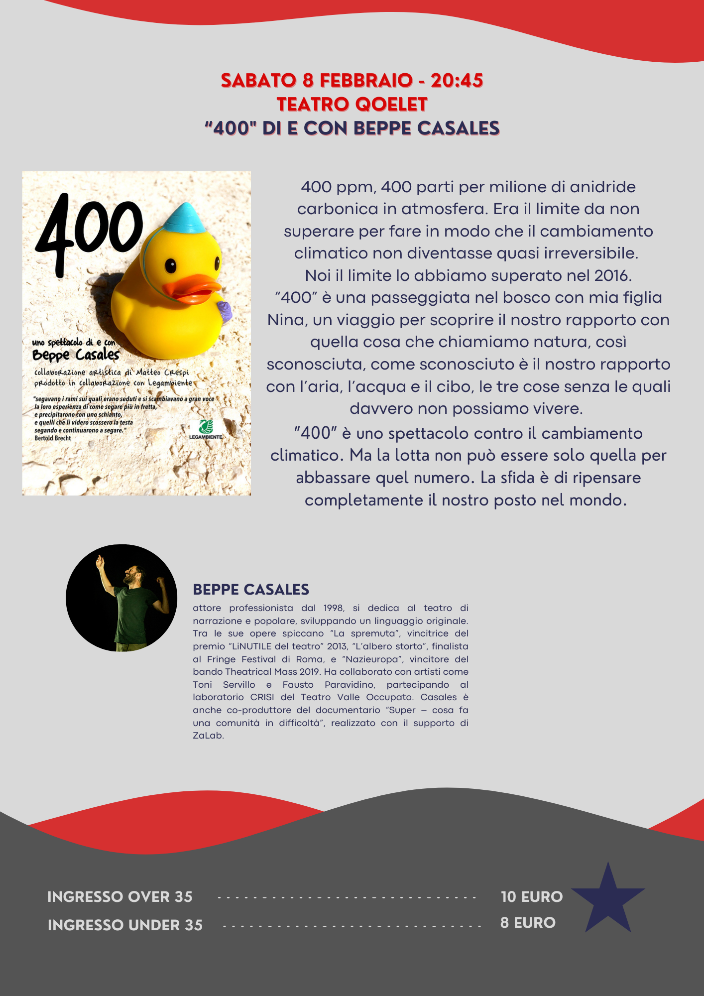 ”400” è uno spettacolo contro il cambiamento climatico. Ma la lotta non può essere solo quella per abbassare quel numero. La sfida è di ripensare completamente il nostro posto nel mondo.