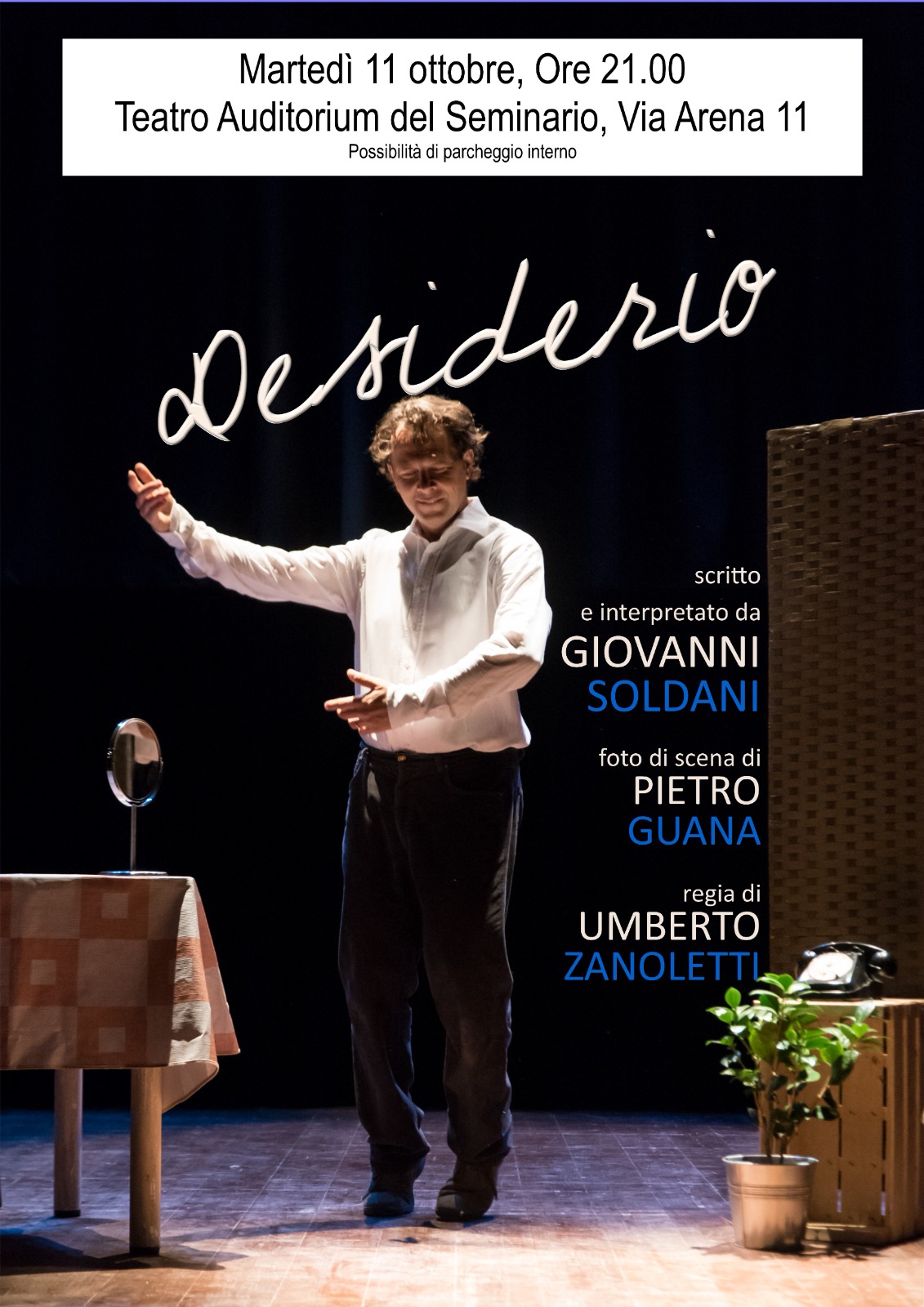“Desiderio” è il nome del protagonista del monologo. Si tratta di una storia vera e liberamente rivisitata (anche se con profondo rispetto). Infatti Desiderio è il racconto: di un bambino ultimo di tanti fratelli; di un ragazzo cresciuto grazie soprattutto all’affetto di uno zio; di un giovane, forse troppo giovane per essere sposo e sicuramente troppo giovane per essere padre; di un adulto che si fa presto vecchio a causa dell’alcol, fino a toccare il fondo di una vita ai margini della società… e una panchina della stazione che si fa casa. E poi una svolta e poi la svolta, inaspettata, sorprendente, improvvisa.