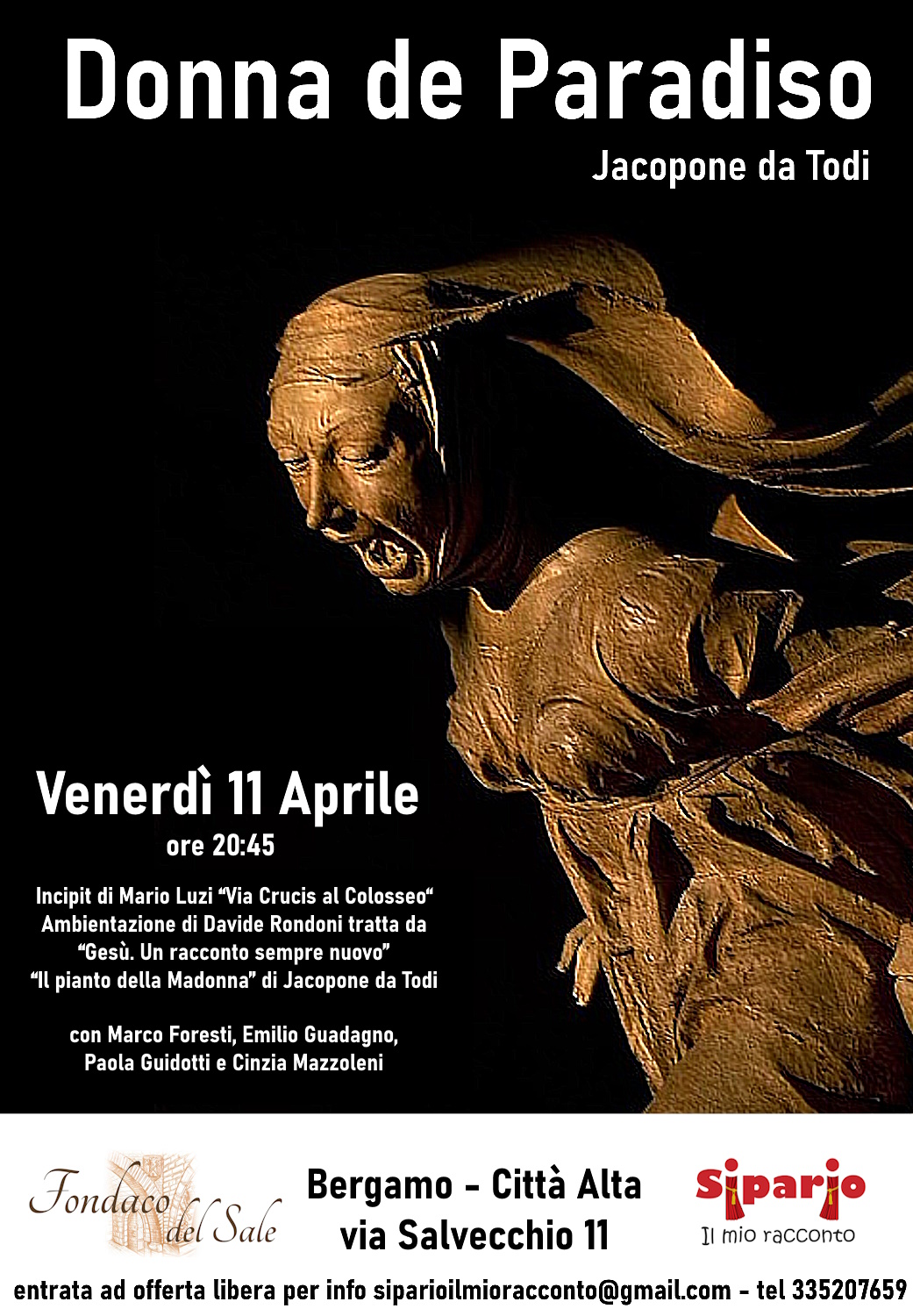 “Il pianto della Madonna”, lauda anche detta “Donna de Paradiso” dal primo verso pronunciato da Giovanni rivolgendosi a Maria, di Jacopone da Todi è l'esempio più famoso di lauda drammatica, nonché in assoluto la prima (XIII secolo), costruita interamente sotto forma di un concitato dialogo tra san Giovanni Evangelista, Gesù, la Madonna e la folla durante gli ultimi momenti della vita di Cristo. La messa in scena teatralizzata prevede un incipit di Mario Luzi e l’aggiunta di una parte iniziale tratta da “Gesù. Un racconto sempre nuovo” di Davide Rondoni che contestualizza magistralmente la lauda finale partendo dall’orto degli ulivi a Pilato sino al Calvario.