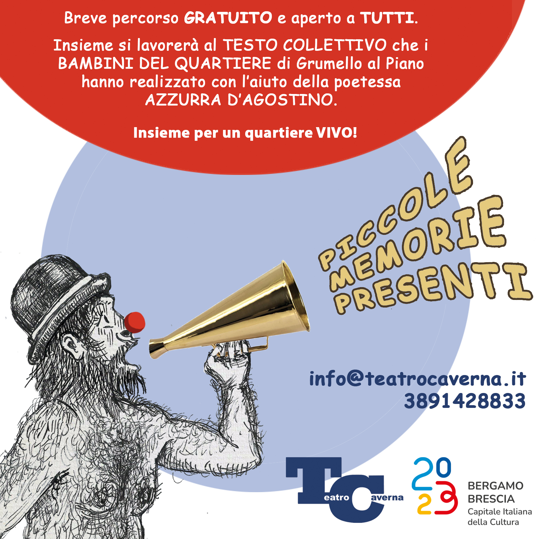 Sabato 11 Novembre, alle 16:30 presso lo Spazio Caverna di Via Tagliamento 7 a Bergamo, si terrร lo spettacolo finale Nascere era bellissimo realizzato dai partecipanti al laboratorio "Piccole Memorie Presenti". Il lavoro รจ stato costruito intorno al testo collettivo che i bambini del quartiere di Grumello al Piano hanno realizzato con l'aiuto della poetessa Azzurra D'Agostino negli scorsi mesi.