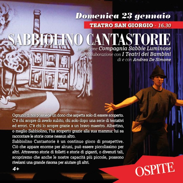 Il Teatro San Giorgio presenta, nella rassegna Giocateatro, lo spettacolo "Sabbiolino Cantastorie" della compagnia Sabbie Luminose.