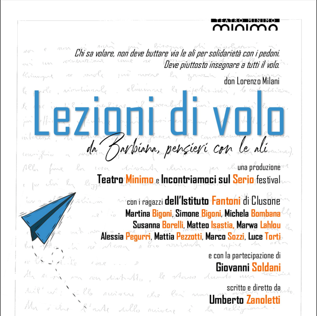 Lezioni di volo racconta le scoperte e le riflessioni vere di un gruppo di ragazzi a scuola durante un laboratorio teatrale attorno ai temi proposti da uno dei pedagogisti più importanti del nostro tempo: la scuola, l’uguaglianza sociale, la partecipazione civile. A raccogliere queste parole contemporanee un attore, guida appassionata e stimolante in un percorso teatrale che trasferisce gradualmente il pubblico in uno spazio e in un tempo distante 60 anni.