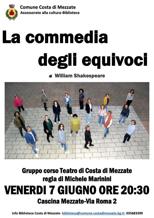 Il gruppo di attori del corso di teatro di Costa di Mezzate, con la regia di Michele Marinini, porterà in scena l'opera teatrale "La Commedia degli equivoci" di William Shakespeare.