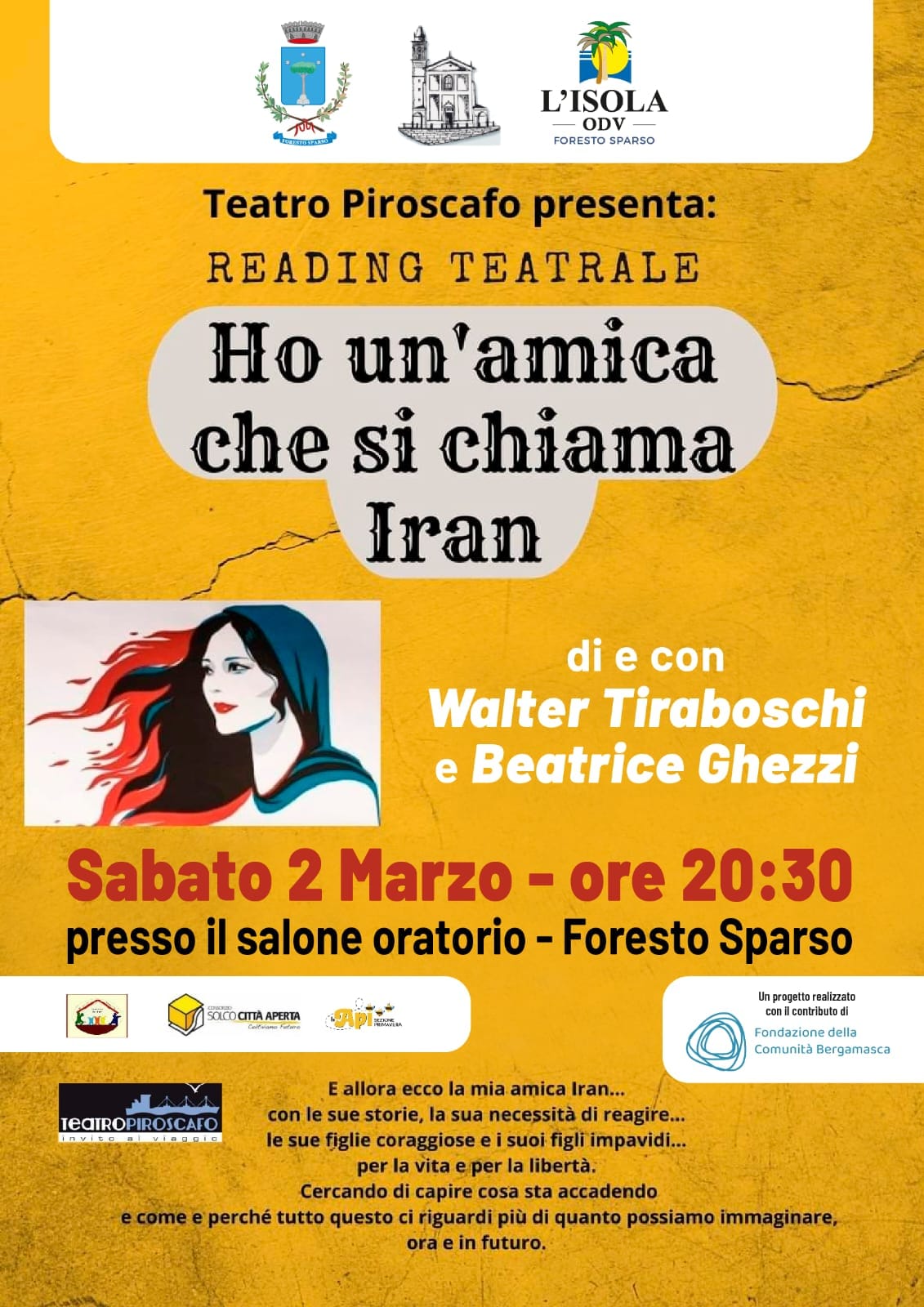 La biblioteca di Foresto Sparso tiene lo spettacolo "Ho un'amica che si chiama Iran" di e con Walter Tiraboschi e Beatrice Ghezzi.