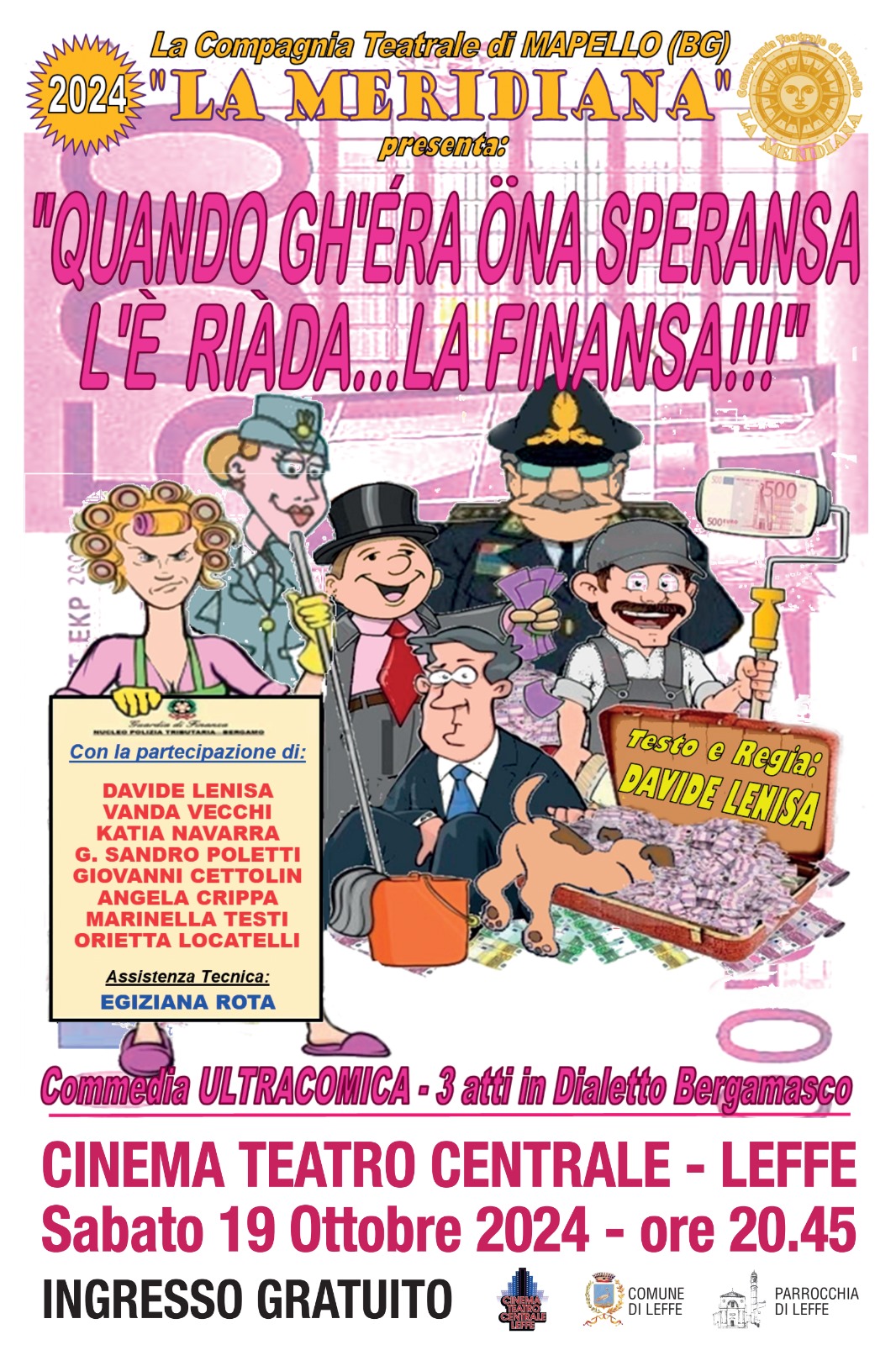 Sabato 19 ottobre alle ore 20.45, vi aspetta uno spettacolo da non perdere: la commedia in 3 atti in dialetto bergamasco dal titolo "Quando gh'éra öna speransa l'è riàda... la finansa!".
