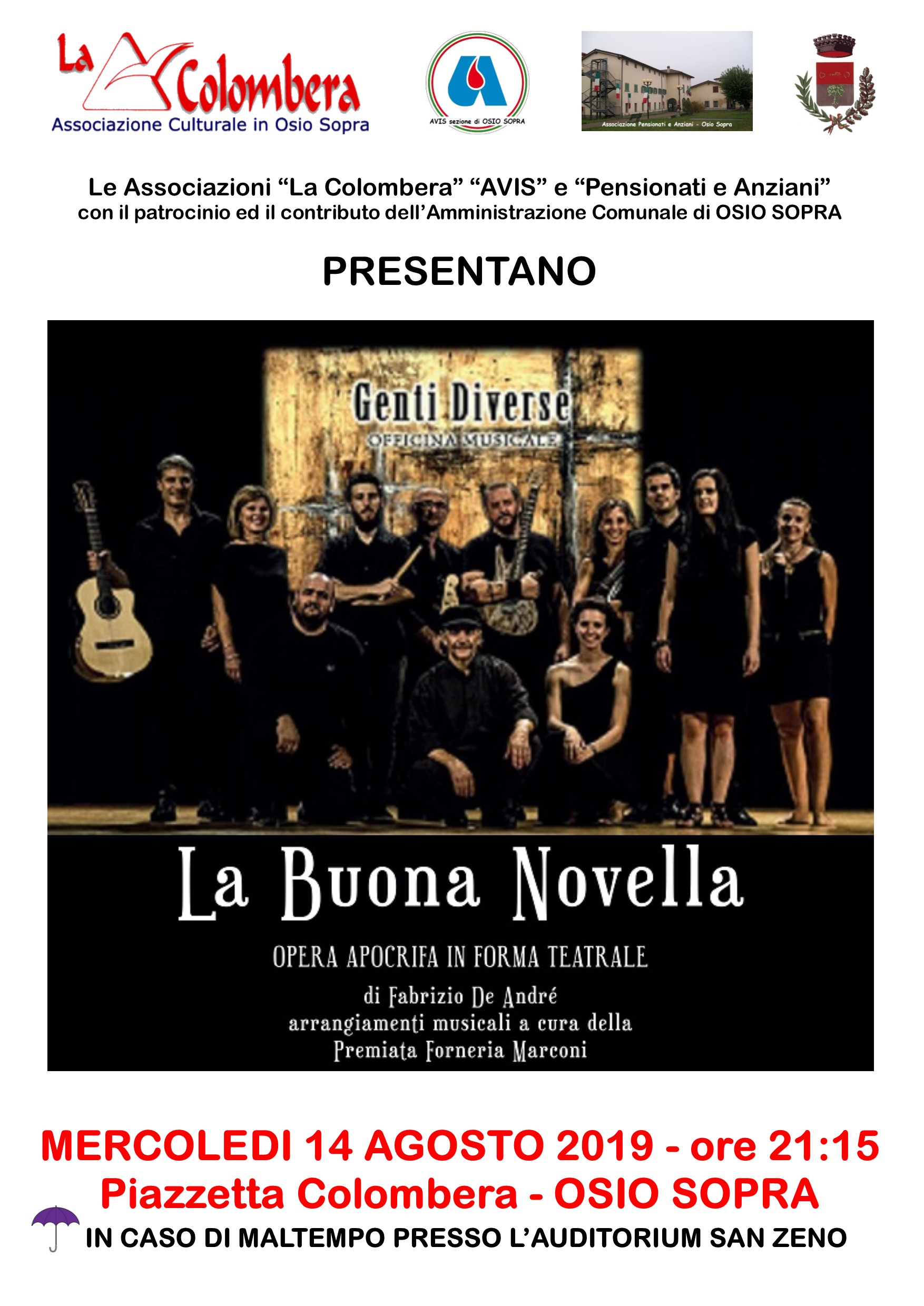 Mercoledì 14 agosto alle 21,15 in Piazzetta Colombera a Osio Sopra, in occasione della Sagra di Ferragosto organizzata da "Associazione La Colombera" "AVIS" e "Associazione Pensionati e Anziani" con il contributo ed il patrocinio dell'Amministrazione Comunale, il gruppo "Genti Diverse - Officina Musicale" presenta lo spettacolo «La buona novella», tratto dall'opera che Fabrizio De André scrisse cinquant'anni fa, nel 1969, eseguita però con gli arrangiamenti che la PFM fece nel 2010 ed arricchita dagli interventi di un narratore che spiega e contestualizza la storia con aneddoti tratti dai Vangeli Apocrifi. Ingresso gratuito.