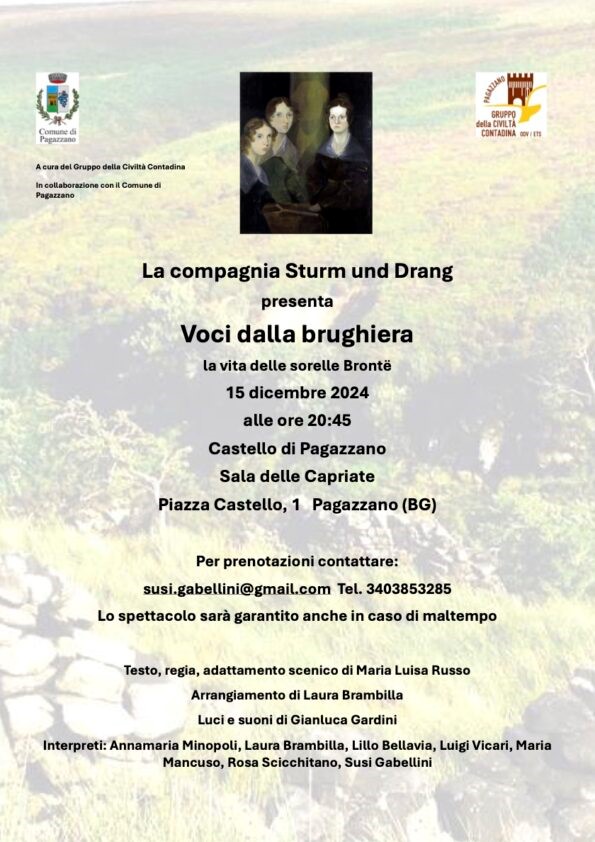 Il Castello di Pagazzano fa da cornice allo spettacolo "Voci dalla brughiera", dedicato alle sorelle Brontë. In un'ambientazione suggestiva, si potrà rivivere le atmosfere dei romanzi che hanno appassionato generazioni di lettori. La Compagnia Strum Uno Drang vi porterà alla scoperta del mondo delle celebri scrittrici inglesi. Attraverso le loro storie personali e le loro opere, potremo conoscere meglio queste donne straordinarie che hanno lasciato un segno indelebile nella letteratura mondiale. Impossibile mancare!