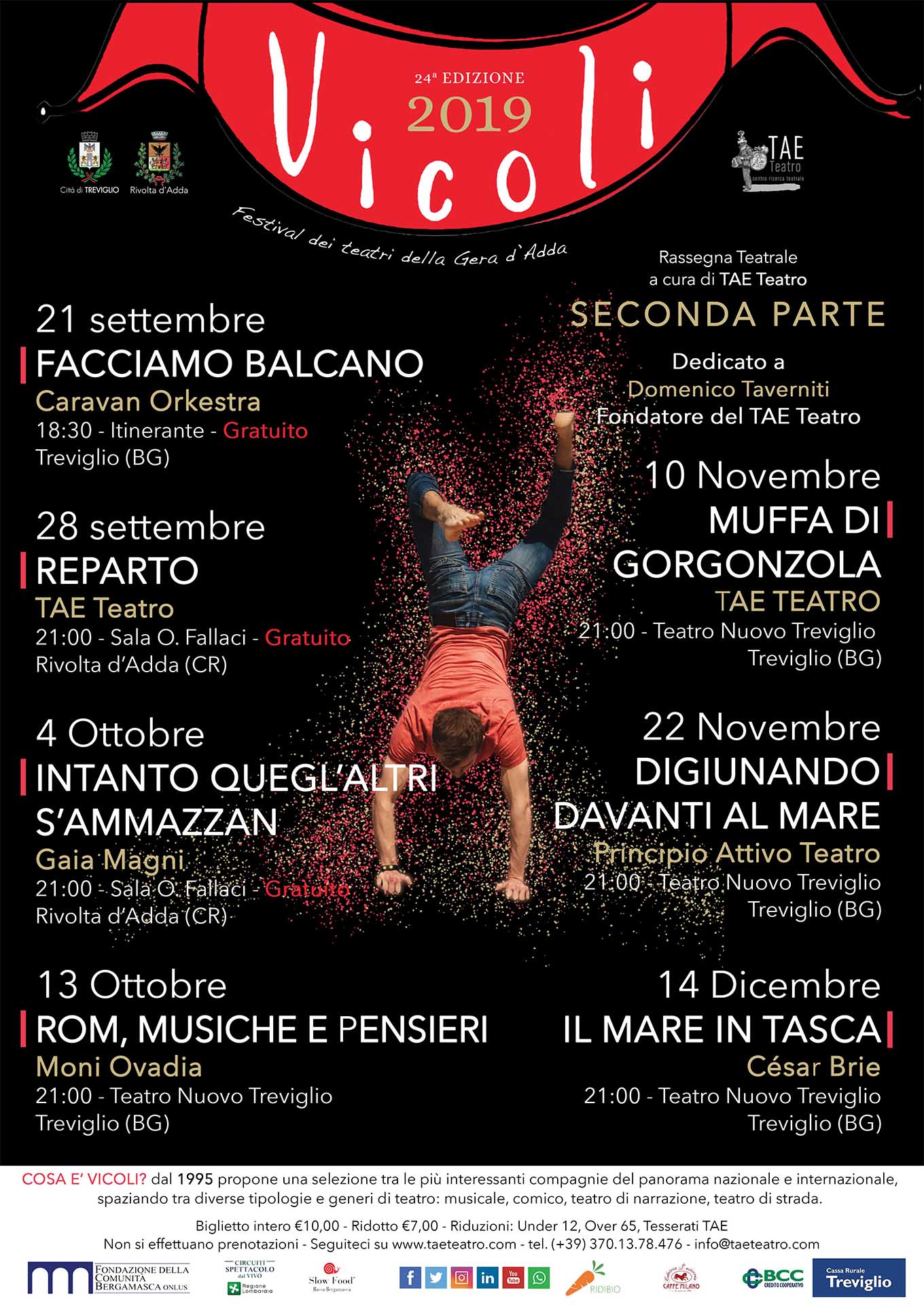 Riprende da settembre la storica rassegna teatrale ideata e organizzata da TAE Teatro, con gli spettacoli di "VICOLI - Festival dei Teatri della Gera d'Adda" grazie al Patrocinio dei Comuni di Treviglio e di Rivolta d’Adda, Provincia di Bergamo,Fondazione della Comunità Bergamasca e inserito nei Circuiti Spettacolo dal Vivo di Regione Lombardia.