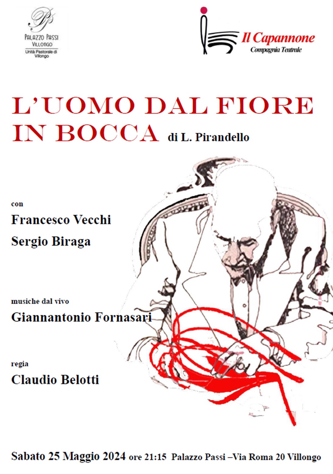 L'uomo dal fiore in bocca รจ il piรน famoso atto unico di Pirandello; il tema centrale del dramma fa emergere una delle tipiche tematiche pirandelliane: Il relativismo della realtร , per cui il quotidiano, tanto banale per alcuni, acquista agli occhi di chi sia vicino alla morte ben altra valenza.. Presentato dalla Compagnia teatrale IL CAPANNONE con la regia di Belotti Claudio; gli attori Biraga Sergio e Vecchi Francesco; musiche dal vivo di Fornasari Giannantonio.