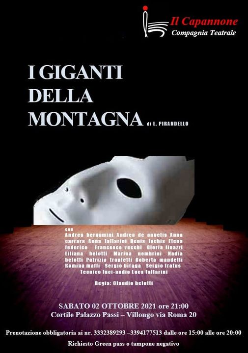 Bene ha fatto il Capannone in quel bellissimo e al tempo stesso struggente spazio che è il cortile del Palazzo conti Passi a Villongo, già sede ai tempi di esperienze meditative e vite consacrate, e ai tempi nostri ritrovata sede di esperienze di vita pastorale e non solo nella comunità villonghese. I Giganti della montagna del Capannone con l'abile regia di Claudio Belotti sono uno spettacolo teatrale vero, con tutto quello che occorre , nulla più nulla meno, nonostante tutto e nonostante il covid 19 e i conseguenti provvedimenti .