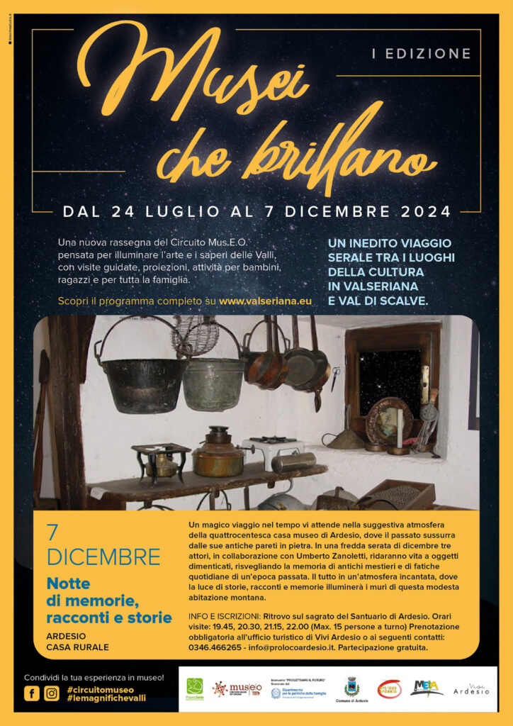 L’iniziativa è parte della Rassegna Musei che brillano pensata dal Circuito Museo del quale fanno parte i musei che aderiscono a Promoserio, per illuminare l’arte e i saperi delle Valli, con visite guidate, proiezioni, attività per bambini, ragazzi e per tutta la famiglia. Un inedito viaggio serale tra i luoghi della cultura in ValSeriana e Val di Scalve.