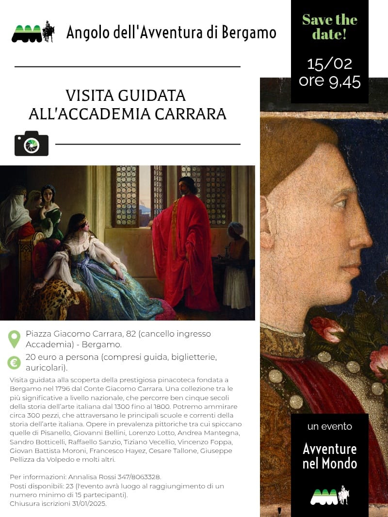 Una visita guidata, proposta da Avventure nel Mondo; alla scoperta della prestigiosa pinacoteca fondata a Bergamo nel 1796 dal Conte Giacomo Carrara. Una collezione tra le più significative a livello nazionale, che percorre ben cinque secoli della storia dell’arte italiana dal 1300 fino al 1800.Potremo ammirare circa 300 pezzi, che attraversano le principali scuole e correnti della storia dell’arte italiana. Opere in prevalenza pittoriche tra cui spiccano quelle di Pisanello, Giovanni Bellini, Lorenzo Lotto, Andrea Mantegna, Sandro Botticelli, Raffaello Sanzio, Tiziano Vecellio, Vincenzo Foppa, Giovan Battista Moroni, Francesco Hayez, Cesare Tallone, Giuseppe Pellizza da Volpedo e molti altri.