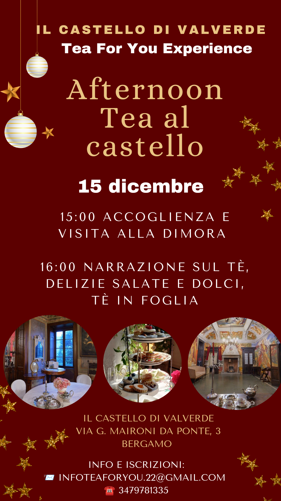 Un'esperienza unica vi aspetta a Bergamo, nella suggestiva cornice del Castello di Valverde, dove potrete immergervi nella storia e nella tradizione del tè in un’atmosfera raffinata e accogliente. Durante il pomeriggio di domenica 15 dicembre, avrete l'opportunità di esplorare le stanze affascinanti della dimora, guidati dalla voce narrante della famiglia Cattaneo Carrara. Scoprirete il fascino di un vero castello del X secolo, trasformato nel corso dei secoli in una residenza cinquecentesca. La visita vi condurrà attraverso i secoli, dalla costruzione delle celebri mura di fortificazione di Città Alta, fino alle straordinarie vicende di Lidia Gelmi Cattaneo, una figura di grande valore storico: prima bergamasca a ottenere il riconoscimento di "Giusto fra le Nazioni" nel 1974, prima donna bergamasca a conseguire la patente di guida nel 1932, miniaturista di fama e appassionata di archeologia.