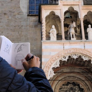 Viaggio attraverso tre luoghi storici di Città Alta con una matita e un quaderno per gli schizzi.