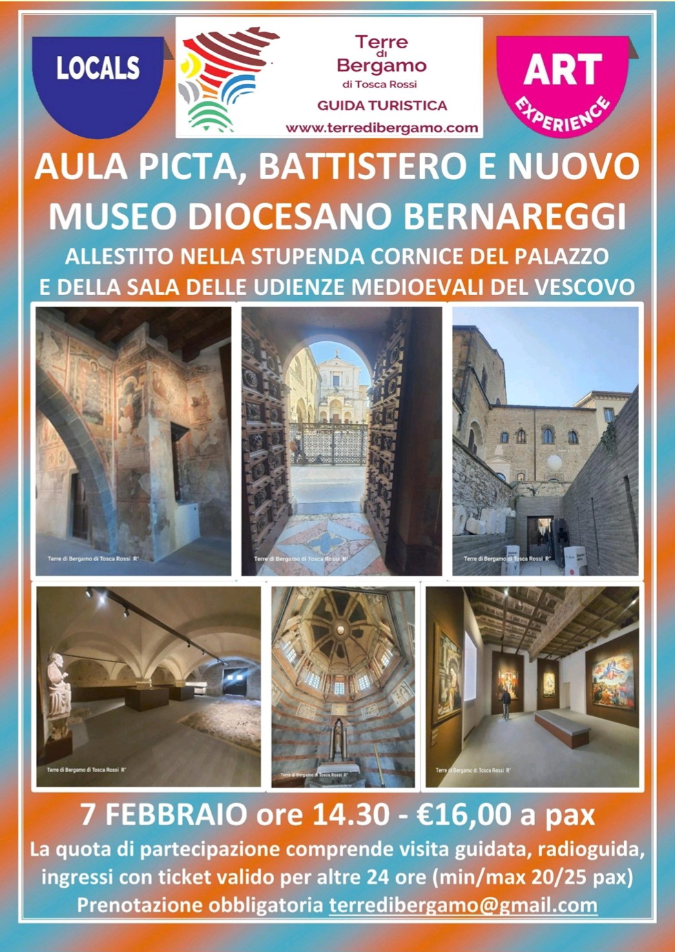 Visita guidata del nuovo Museo Bernareggi attraverso gli ambienti delle scuderie e del palazzo vescovile medioevale - sapientemente affrescati con una miriade di motivi policromi a partire dal XIII secolo - in cui sono stati allestiti i nuovi resti archeologici, le porzioni romaniche relative la muratura e la scultura della Basilica di Santa Maria Maggiore, le 3 pale rinascimentali di Lorenzo Lotto, la collezione di dipinti di natura morta con strumenti musicali di Evaristo Baschenis.