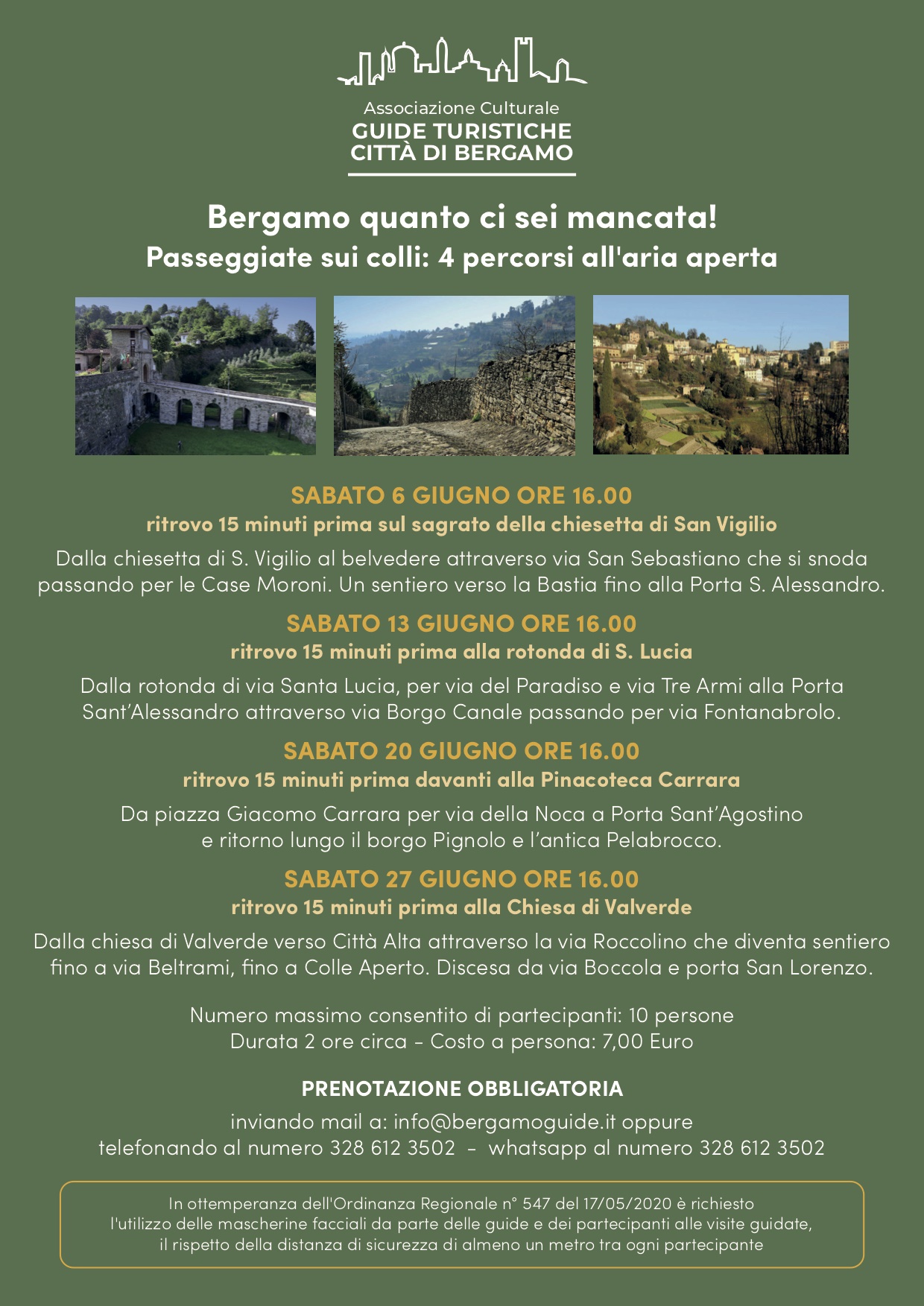 Le Guide Turistiche Città di Bergamo propongono quattro percorsi all'aria aperta. Quattro passeggiate sui colli denominate "Bergamo quanto ci sei mancata!".