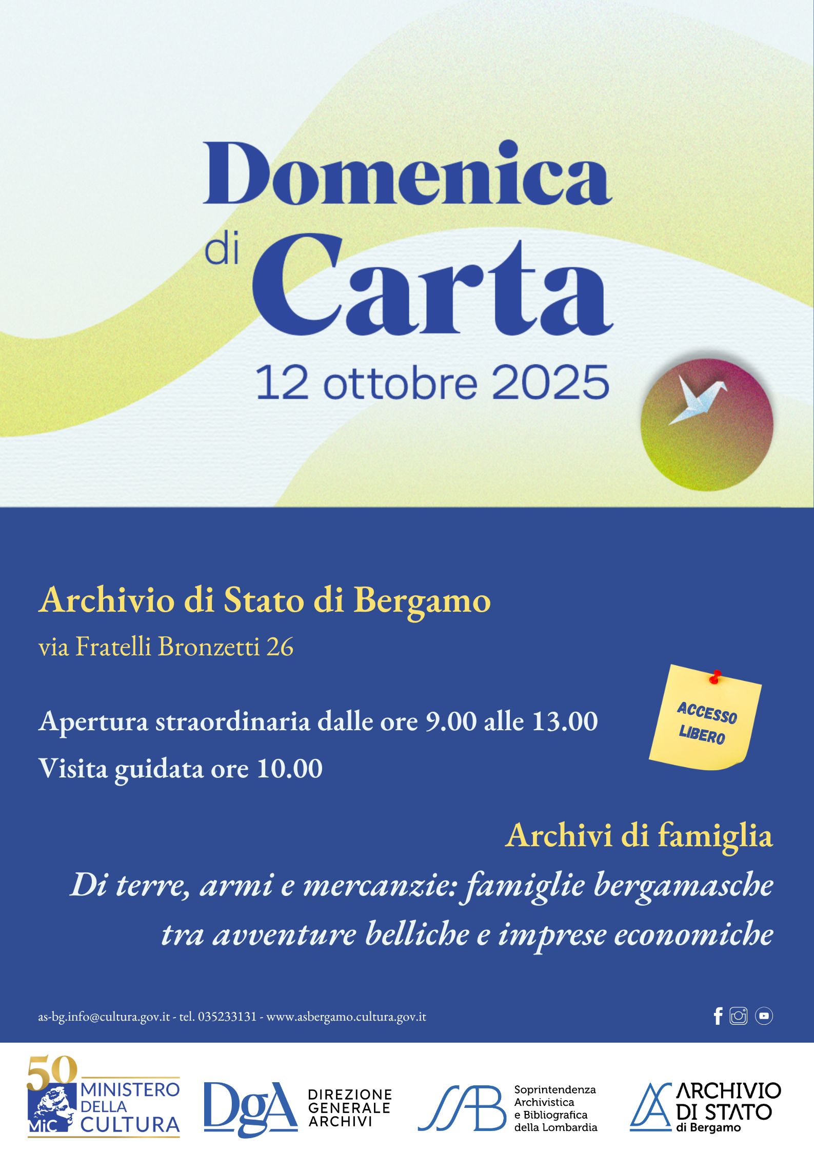 In occasione della «Domenica di Carta 2025», l’Archivio di Stato di Bergamo aprirà le porte ai visitatori per guidarli alla scoperta del patrimonio conservato, delle attività di tutela e valorizzazione e della sede di Istituto.