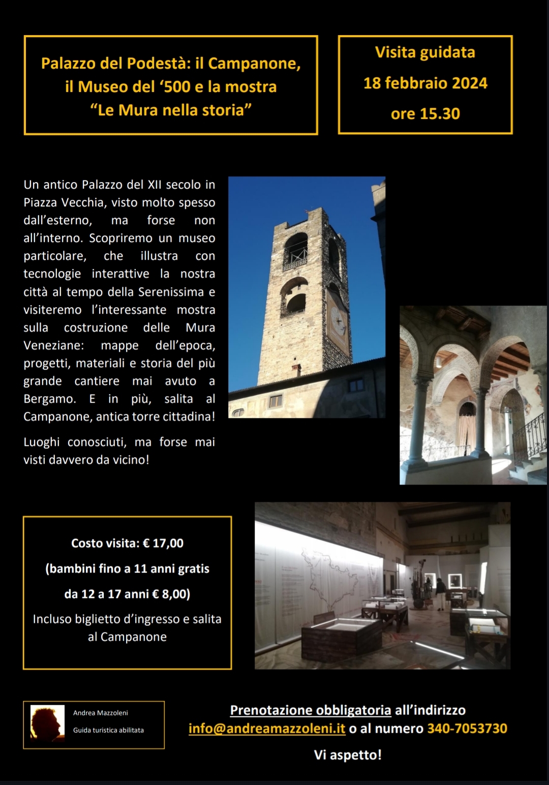 Un antico Palazzo del XII secolo in Piazza Vecchia, visto molto spesso dall’esterno, ma forse non all’interno. Scopriremo un museo particolare, che illustra con tecnologie interattive la nostra città al tempo della Serenissima e visiteremo l’interessante mostra sulla costruzione delle Mura Veneziane: mappe dell'epoca, progetti, materiali e storia del più grande cantiere mai avuto a Bergamo. E in più, salita al Campanone, antica torre cittadina! Luoghi conosciuti, ma forse mai visti davvero da vicino!