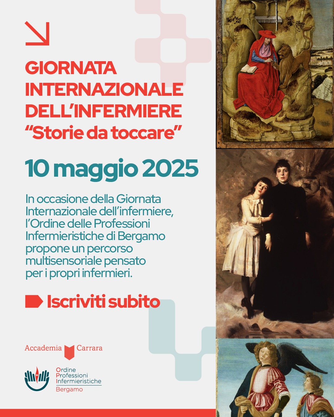 In vista della Giornata Internazionale dellโInfermiere, che si celebra il 12 maggio, lโOrdine delle Professioni Infermieristiche (Opi) di Bergamo organizza per sabato 10 maggio 2025 un evento speciale dedicato a chi ogni giorno si prende cura degli altri. Si tratta di โStorie da toccareโ, un percorso esperienziale e multisensoriale allโinterno dellโAccademia Carrara, pensato per restituire attenzione e valore al lavoro degli infermieri. Durante lโiniziativa, i partecipanti avranno lโopportunitร di avvicinarsi allโarte in modo nuovo, esplorando dipinti, sculture e medaglie attraverso il tatto, le texture e materiali differenti. Un viaggio tra diverse โtipologie di pelleโ, concepito per stimolare una riflessione profonda sul senso della cura e sullโesperienza personale e professionale di ogni infermiere.