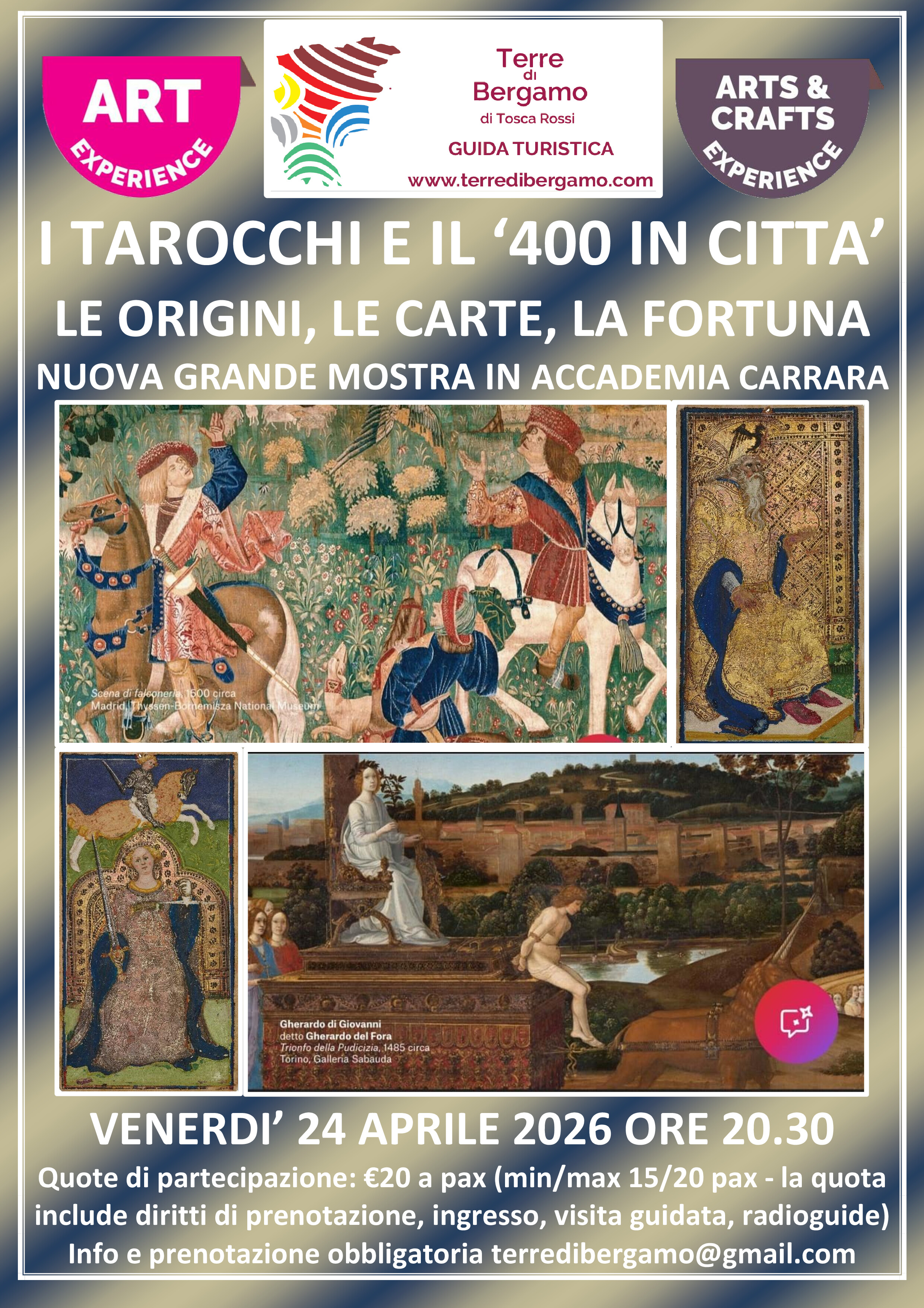 Visita guidata alla nuova grande mostra dedicata alla magica saga dei tarocchi - dal lusso delle corti rinascimentali alla creatività contemporanea - con una narrazione lunga sette secoli, la più ampia realizzata fino ad oggi, intorno al mondo del più celebre gioco di carte, con l’eccezionale riunione dopo oltre un secolo delle 74 carte del mazzo Colleoni, diviso dagli inizi del XX secolo tra una collezione privata bergamasca, l’Accademia Carrara e The Morgan Library di New York.