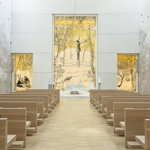 Dietro l’altare, la toccante Crocifissione di Andrea Mastrovito mette in relazione la sofferenza di Cristo, il dolore della morte e la speranza della salvezza con le vicende umane di chi frequenta l’ospedale, confortando i malati e i loro cari.