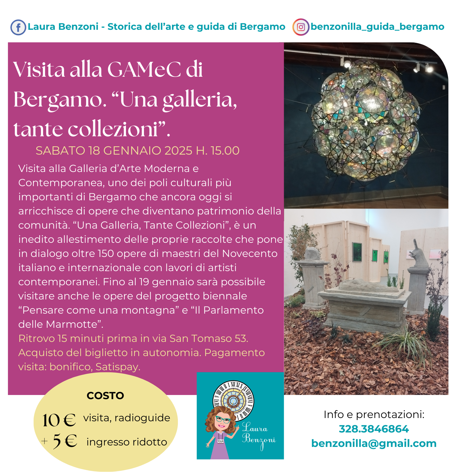 Visita all’esposizione della Galleria d’Arte Moderna e Contemporanea, uno dei poli culturali più importanti di Bergamo che ancora oggi si arricchisce di opere che diventano così patrimonio della comunità. “Una Galleria, Tante Collezioni”, è un inedito allestimento delle proprie raccolte che pone in dialogo oltre 150 opere di maestri del Novecento italiano e internazionale con lavori di artisti contemporanei, in un percorso che si snoda nelle nove sale espositive.